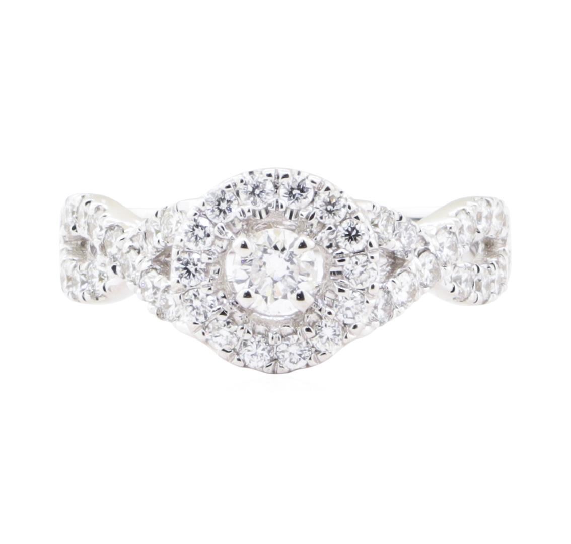 One electronically tested 14KT white gold lady's cast wedding ring with a split shank basket halo with a bright polish finish. The featured lady's ring has a shank measuring 1.90 millimeters wide. Identified with markings of '14K'. Condition is new, good workmanship. Containing: One prong set round brilliant cut diamond, measuring 3.80 - 3.70 x 2.44mm (depth est.) approximate weight of 0.21ct. Color G Clarity SI-1 Cut Good Twenty-Eight prong set round brilliant cut diamonds, measuring 1.80 - 1.70 x 1.09mm (depth est.) approximate total weight of 28 Stones = 0.57ct. Graded in the setting. Color G - I Clarity VS-2 to SI-2 Cut Very Good Fourteen prong set round brilliant cut diamonds, measuring 1.70 - 1.60 x 0.99mm (depth est.) approximate total weight of 14 Stones = 0.22ct. Graded in the setting. Color G - I Clarity SI-1 to SI-2 Cut Very Good. Total Weight of Diamonds 1.00 ct.. Total Weight of Ring 3.30gm GAS Appraised at $4530.00. GAS Appraised.
