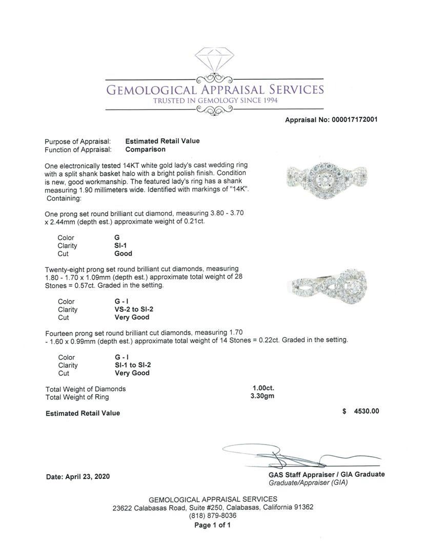 One electronically tested 14KT white gold lady's cast wedding ring with a split shank basket halo with a bright polish finish. The featured lady's ring has a shank measuring 1.90 millimeters wide. Identified with markings of '14K'. Condition is new, good workmanship. Containing: One prong set round brilliant cut diamond, measuring 3.80 - 3.70 x 2.44mm (depth est.) approximate weight of 0.21ct. Color G Clarity SI-1 Cut Good Twenty-Eight prong set round brilliant cut diamonds, measuring 1.80 - 1.70 x 1.09mm (depth est.) approximate total weight of 28 Stones = 0.57ct. Graded in the setting. Color G - I Clarity VS-2 to SI-2 Cut Very Good Fourteen prong set round brilliant cut diamonds, measuring 1.70 - 1.60 x 0.99mm (depth est.) approximate total weight of 14 Stones = 0.22ct. Graded in the setting. Color G - I Clarity SI-1 to SI-2 Cut Very Good. Total Weight of Diamonds 1.00 ct.. Total Weight of Ring 3.30gm GAS Appraised at $4530.00. GAS Appraised.