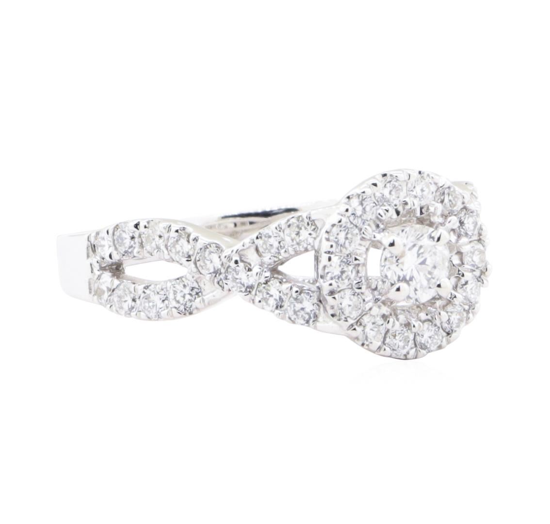 One electronically tested 14KT white gold lady's cast wedding ring with a split shank basket halo with a bright polish finish. The featured lady's ring has a shank measuring 1.90 millimeters wide. Identified with markings of '14K'. Condition is new, good workmanship. Containing: One prong set round brilliant cut diamond, measuring 3.80 - 3.70 x 2.44mm (depth est.) approximate weight of 0.21ct. Color G Clarity SI-1 Cut Good Twenty-Eight prong set round brilliant cut diamonds, measuring 1.80 - 1.70 x 1.09mm (depth est.) approximate total weight of 28 Stones = 0.57ct. Graded in the setting. Color G - I Clarity VS-2 to SI-2 Cut Very Good Fourteen prong set round brilliant cut diamonds, measuring 1.70 - 1.60 x 0.99mm (depth est.) approximate total weight of 14 Stones = 0.22ct. Graded in the setting. Color G - I Clarity SI-1 to SI-2 Cut Very Good. Total Weight of Diamonds 1.00 ct.. Total Weight of Ring 3.30gm GAS Appraised at $4530.00. GAS Appraised.