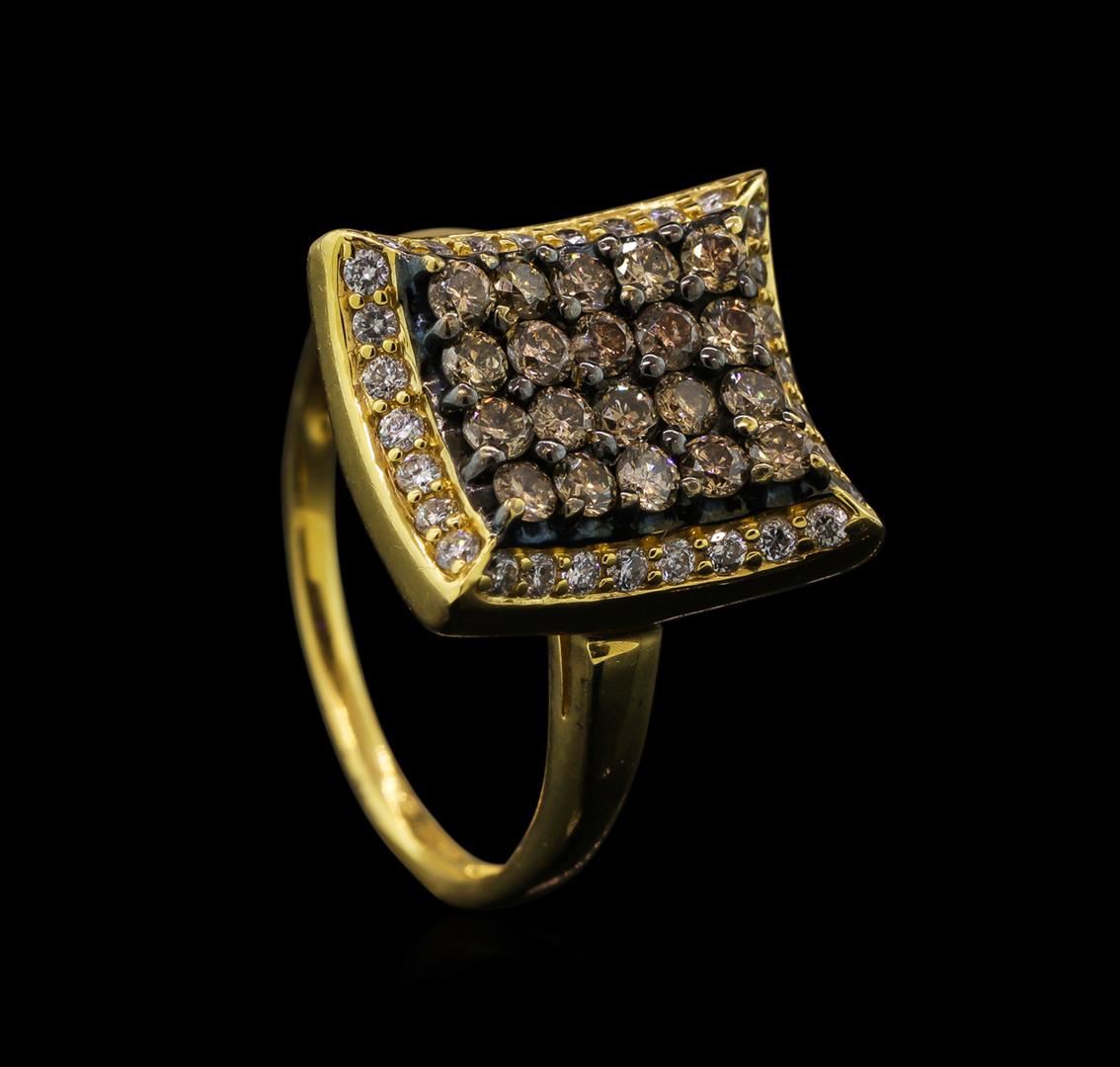 One electronically tested 14KT yellow gold ladies cast diamond ring with a bright and anodized finish. The ring features an organized diamond cluster set within a stylized diamond bezel supported by a lattice under gallery, completed by a one and one-half millimeter wide band. Identified with markings of '14K'. Condition is good. Containing: Twenty prong set round brilliant cut diamonds, measuring 2.10 - 2.00 x 1.23mm (depth est.) approximate total weight of 20 Stones = 0.71ct. Color grade is an average for the group. Graded in the setting. Clarity SI-2 to I-2 Thirty bead set round brilliant cut diamonds, measuring 1.30 - 1.30 x 0.78mm (depth est.) approximate total weight of 30 Stones = 0.29ct. Graded in the setting. Clarity I-1 to I-2. Color: G - H. Total Weight of Diamonds 1.00ct.. Total Weight of Ring 5.03gm. AIG Appraised at $3,145.00.