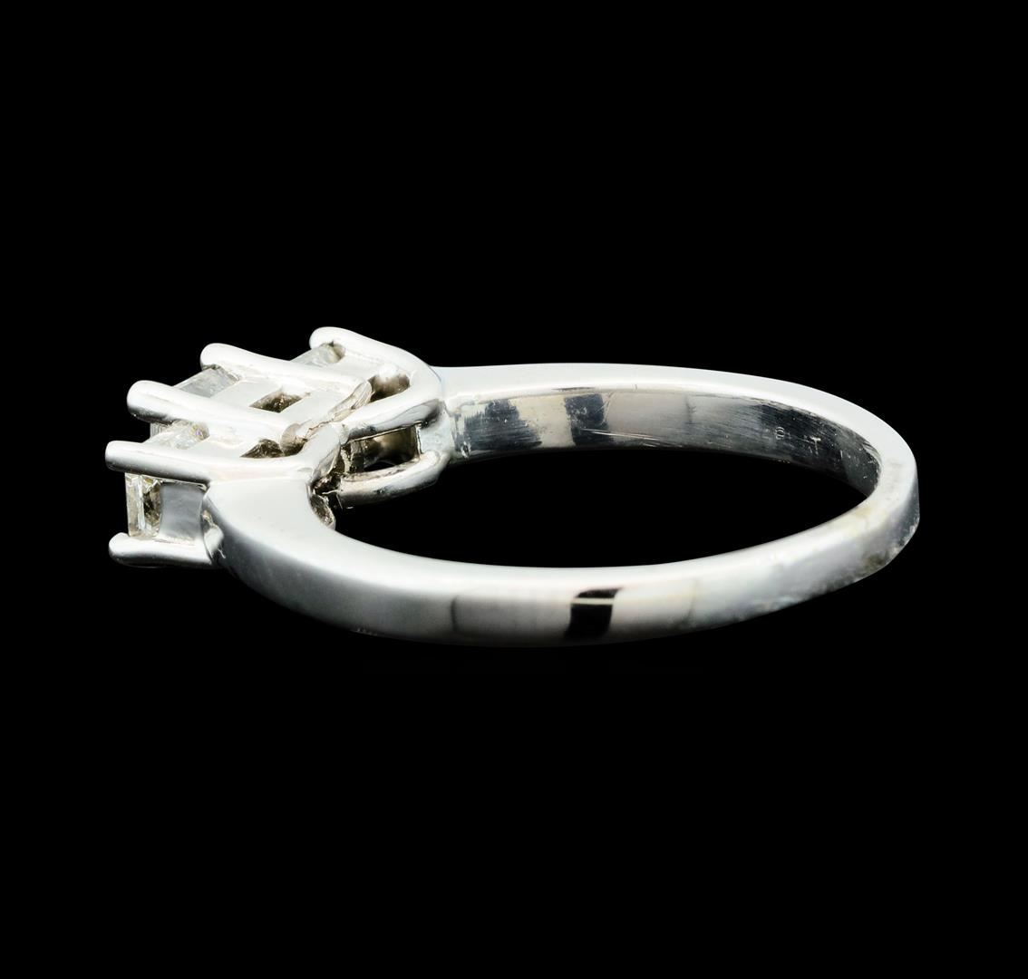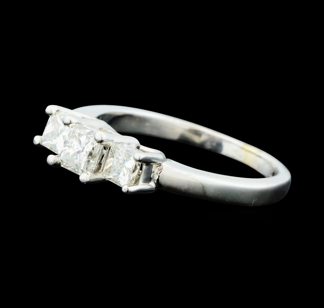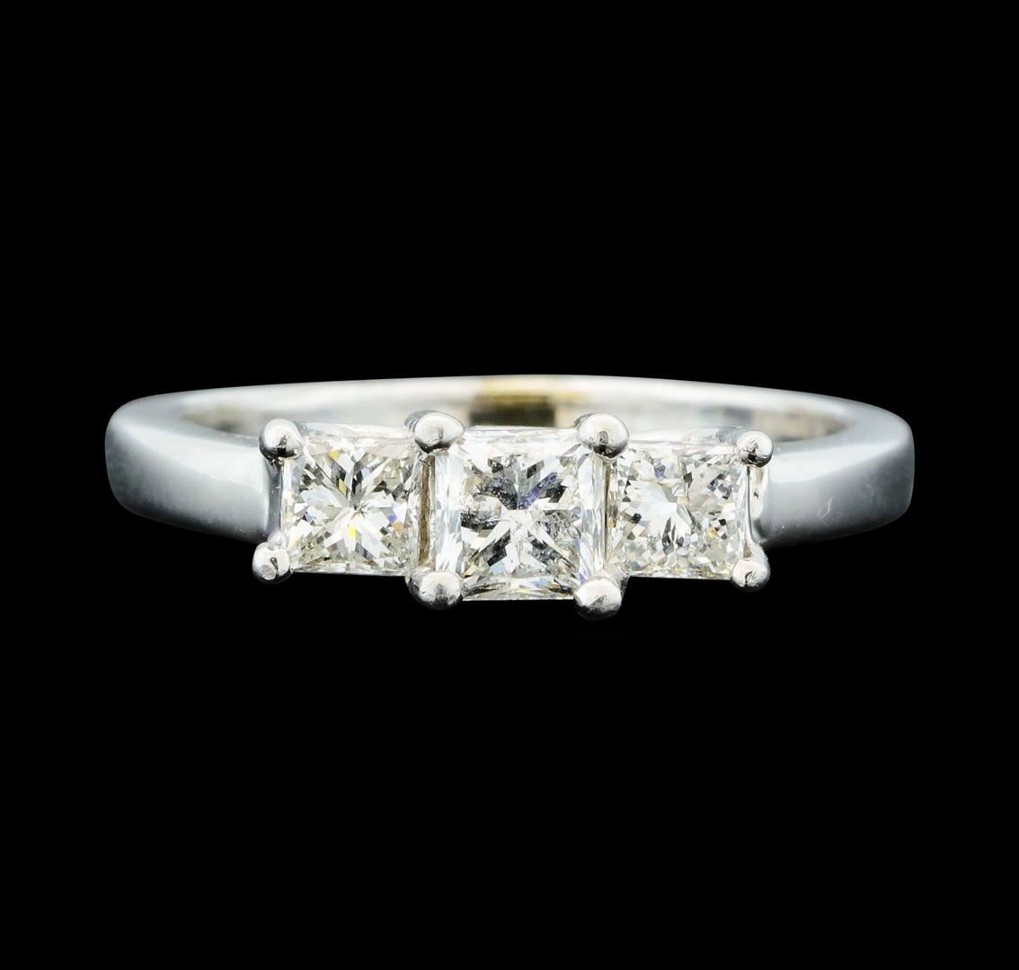 One electronically tested platinum lady's cast 3-stone wedding ring with a straight line with a bright polish finish. The featured lady's ring has a shank measuring 1.92 millimeters wide. Identified with markings of 'PLAT'. Condition is new, good workmanship. Containing: One prong set princess cut diamond, measuring 4.10 x 4.00 x 3.43mm (depth est.) , 5.00.%. GTCF approximate weight of 0.49ct. Graded in the setting. Clarity SI-3. Color: H Cut Very Good Two prong set princess cut diamonds, measuring 3.50 x 3.30 x 2.48mm (depth est.) , 5.00.%. GTCF approximate total weight of 2 Stones = 0.51ct. Graded in the setting. Clarity SI-1 to SI-2. Color: H - I Cut Very Good. Total Weight of Diamonds 1.00ct.. Total Weight of Ring 4.70gm GAS Appraised at $4,645.00.