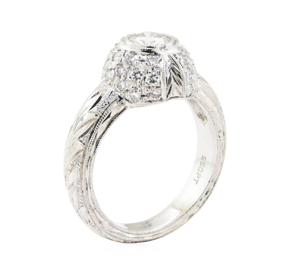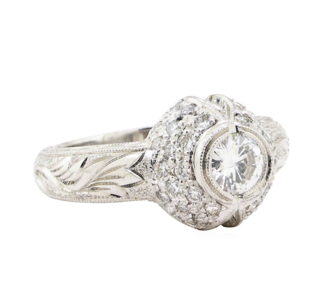 One electronically tested platinum lady's cast wedding ring with a domed shank with a bright polish with milgrain detailing finish. The featured lady's ring has hand engraved details and a shank measuring 3.45 millimeters wide. Identified with markings of
