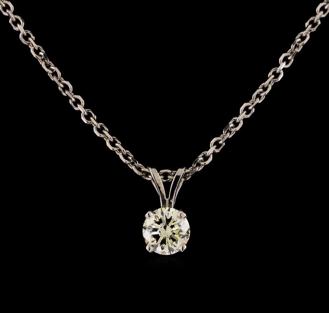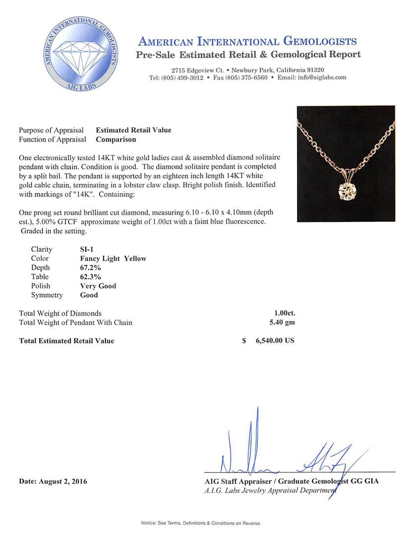 One electronically tested 14KT white gold ladies cast & assembled diamond solitaire pendant with chain. The diamond solitaire pendant is completed by a split bail. The pendant is supported by an eighteen inch length 14KT white gold cable chain, terminating in a lobster claw clasp. Bright polish finish. Identified with markings of '14K'. Condition is good. Containing: One prong set round brilliant cut diamond, measuring 6.10 - 6.10 x 4.10mm (depth est.), 5.00.%. GTCF approximate weight of 1.00ct with a faint blue fluorescence. Graded in the setting. Clarity SI-1. Depth: 67.2%. Table: 62.3%.. Total Weight of Diamonds 1.00ct.. Total Weight of Pendant With Chain 5.40gm. AIG Appraised at $6,540.00.
