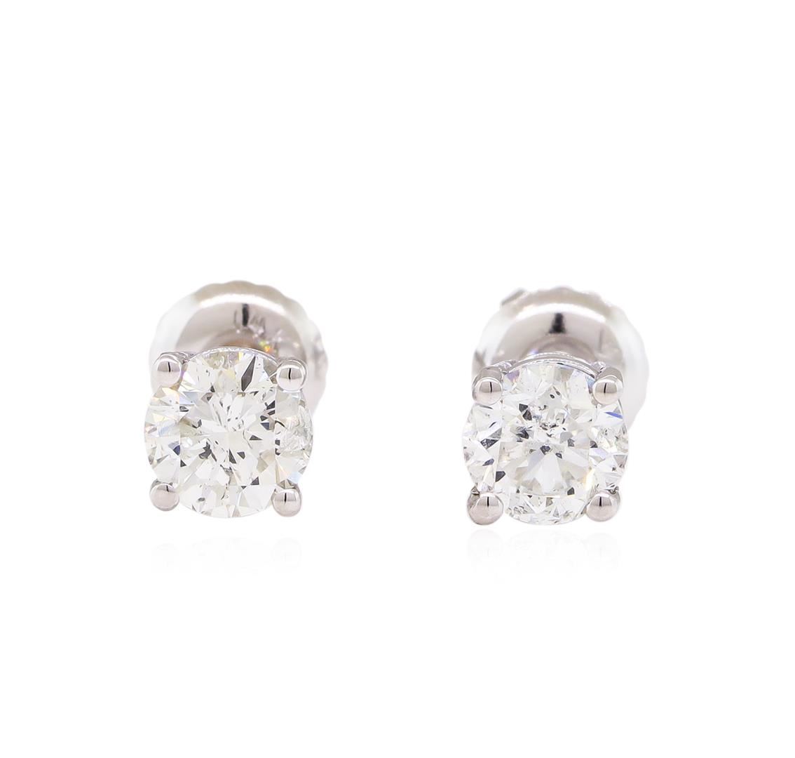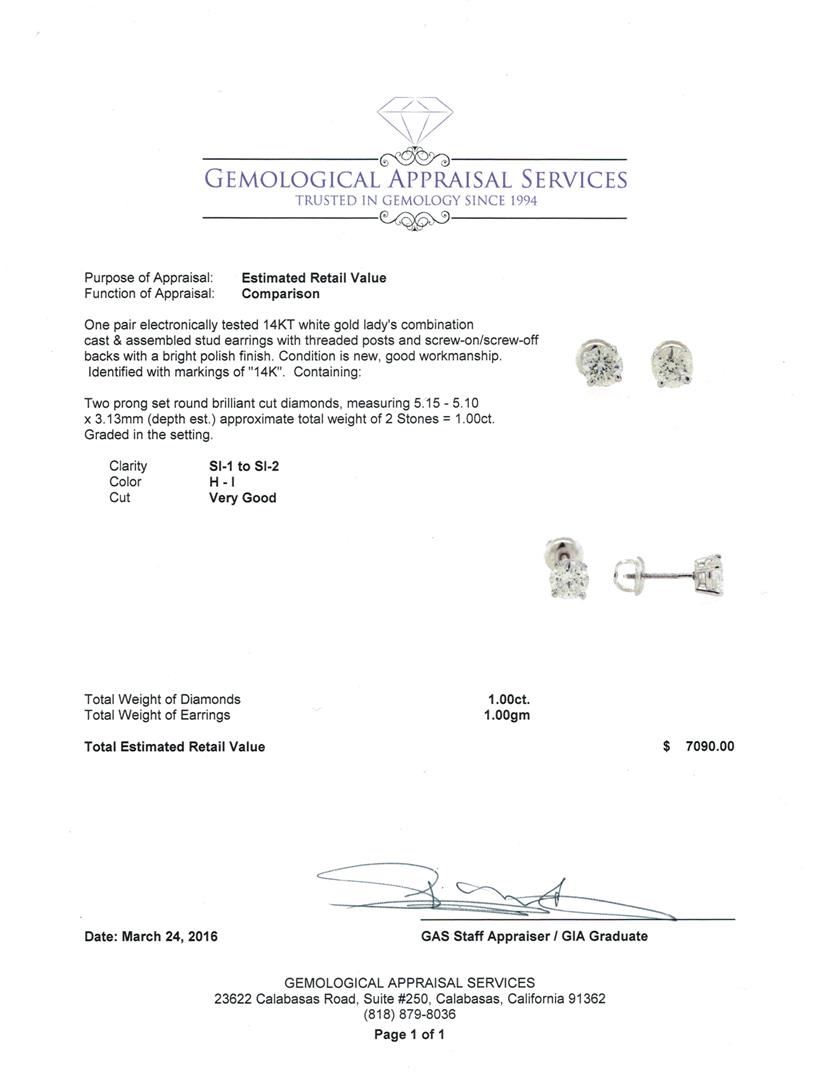 One pair electronically tested 14KT white gold lady's combination cast & assembled stud earrings with threaded posts and screw-on/screw-off backs with a bright polish finish. Identified with markings of "14K". Condition is new, good workmanship. Containing: Two prong set round brilliant cut diamonds, measuring 5.15 - 5.10 x 3.13mm (depth est.) approximate total weight of 2 Stones = 1.00ct. Graded in the setting. Clarity: SI-1 to SI-2. Color: H - I. Cut Very Good. Total Weight of Diamonds 1.00ct. Total Weight of Earrings 1.00gm. GAS Appraised at $7,090.00.