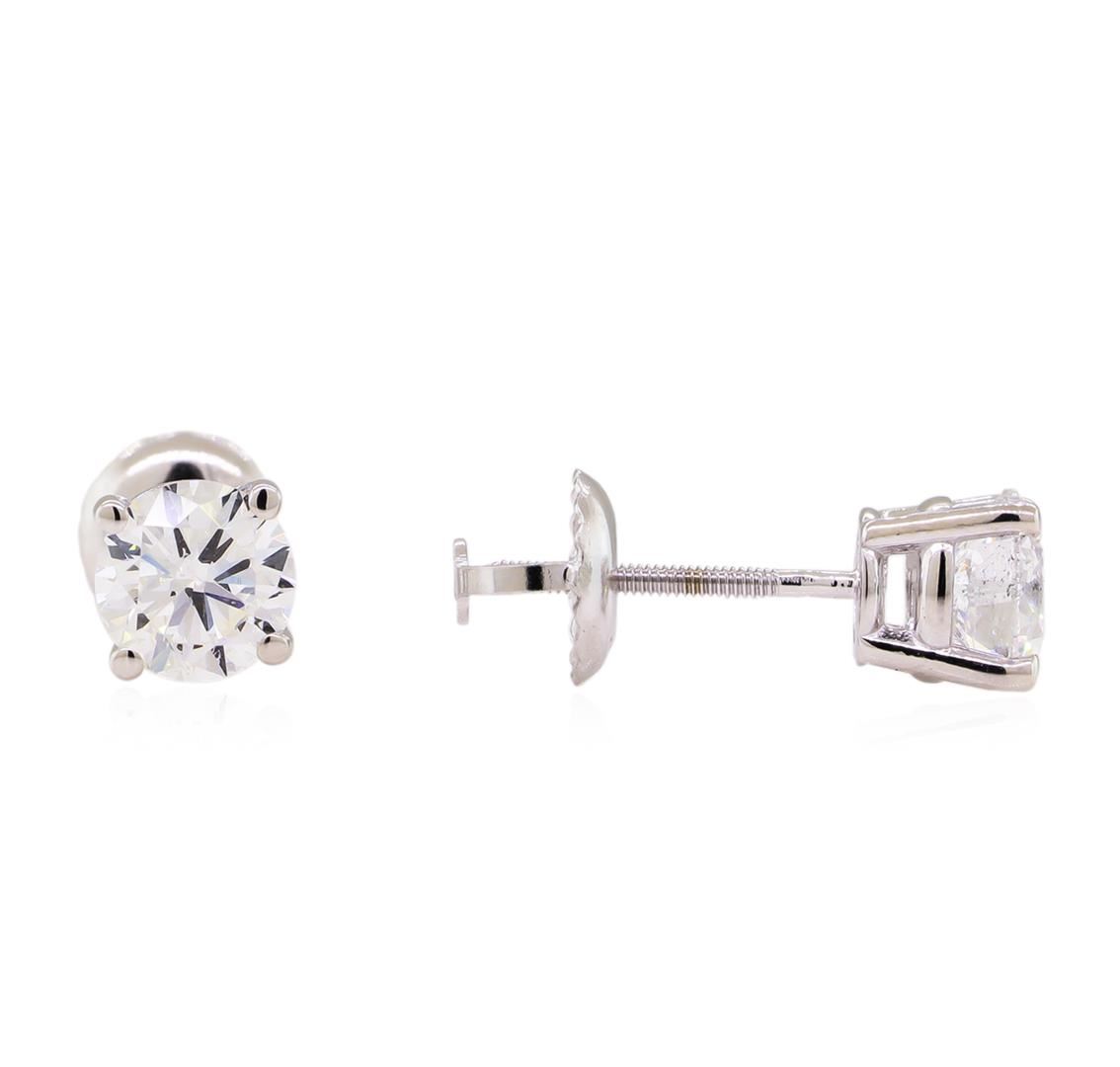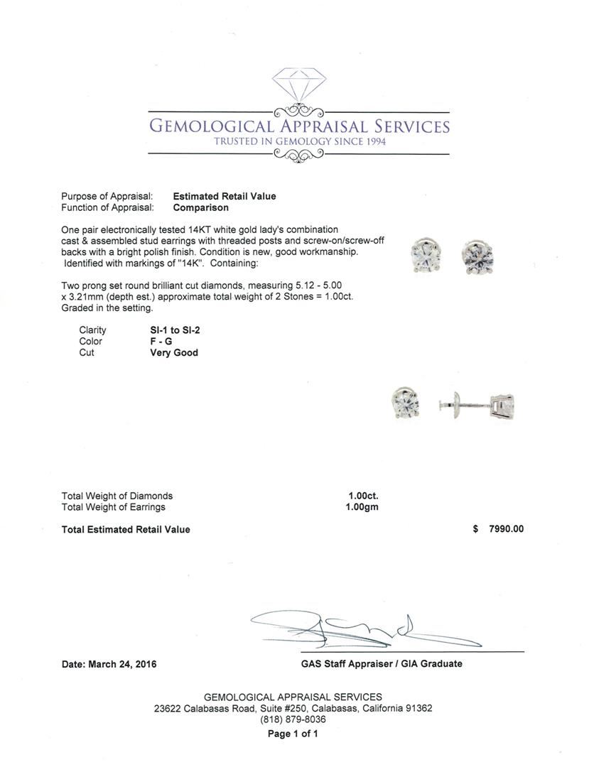One pair electronically tested 14KT white gold lady's combination cast & assembled stud earrings with threaded posts and screw-on/screw-off backs with a bright polish finish. Identified with markings of "14K". Condition is new, good workmanship. Containing: Two prong set round brilliant cut diamonds, measuring 5.12 - 5.00 x 3.21mm (depth est.) approximate total weight of 2 Stones = 1.00ct. Graded in the setting. Clarity: SI-1 to SI-2. Color: F - Very Good. Total Weight of Diamonds 1.00ct. Total Weight of Earrings 1.00gm. GAS Appraised at $7,990.00.