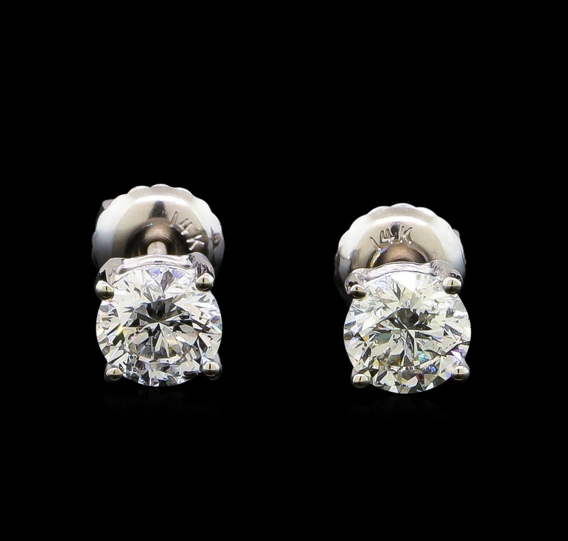 One pair electronically tested 14KT white gold lady's combination cast & assembled diamond stud earrings with threaded posts and screw-on/screw-off backs with a basket setting with a bright polish finish. Identified with markings of "14K". Condition is new, good workmanship. Containing: One prong set round brilliant cut diamond, measuring 5.06 - 5.04 x 3.13mm (depth est.) approximate weight of 0.50ct. Graded in the setting. Clarity: SI-3. Color: Very Good One prong set round brilliant cut diamond, measuring 5.03 - 5.01 x 3.17mm (depth est.) approximate weight of 0.50ct. Graded in the setting. Clarity: SI-3. Color: Very Good. Total Weight of Diamonds 1.00ct. Total Weight of Stud Earrings 1.00gm. GAS Appraised at $5,905.00.