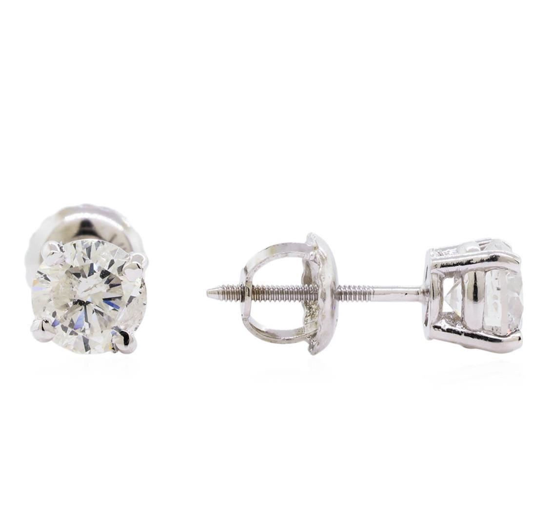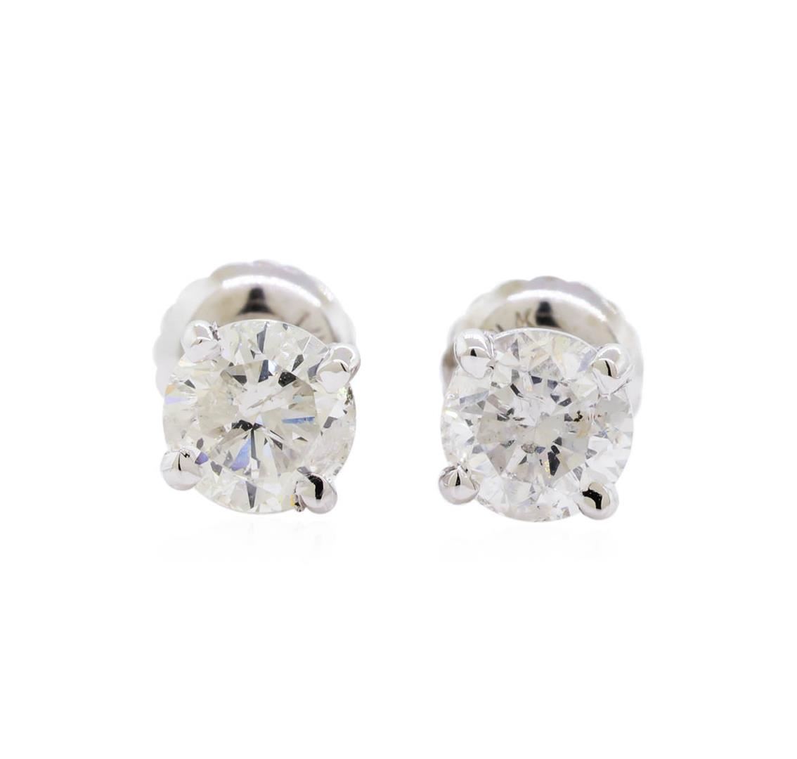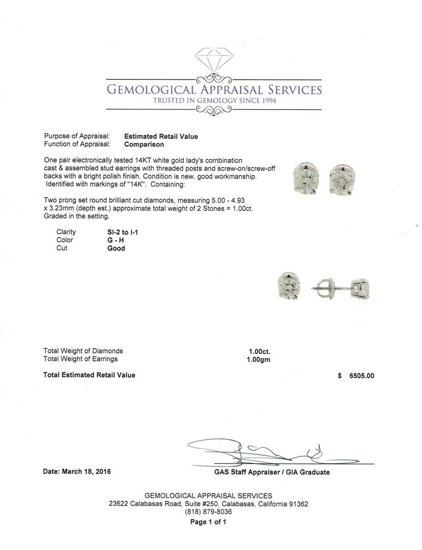 One pair electronically tested 14KT white gold lady's combination cast & assembled stud earrings with threaded posts and screw-on/screw-off backs with a bright polish finish. Identified with markings of "14K". Condition is new, good workmanship. Containing: Two prong set round brilliant cut diamonds, measuring 5.00 - 4.93 x 3.23mm (depth est.) approximate total weight of 2 Stones = 1.00ct. Graded in the setting. Clarity: SI-2 to I-1. Color: G - Good. Total Weight of Diamonds 1.00ct. Total Weight of Earrings 1.00gm. GAS Appraised at $6,505.00.