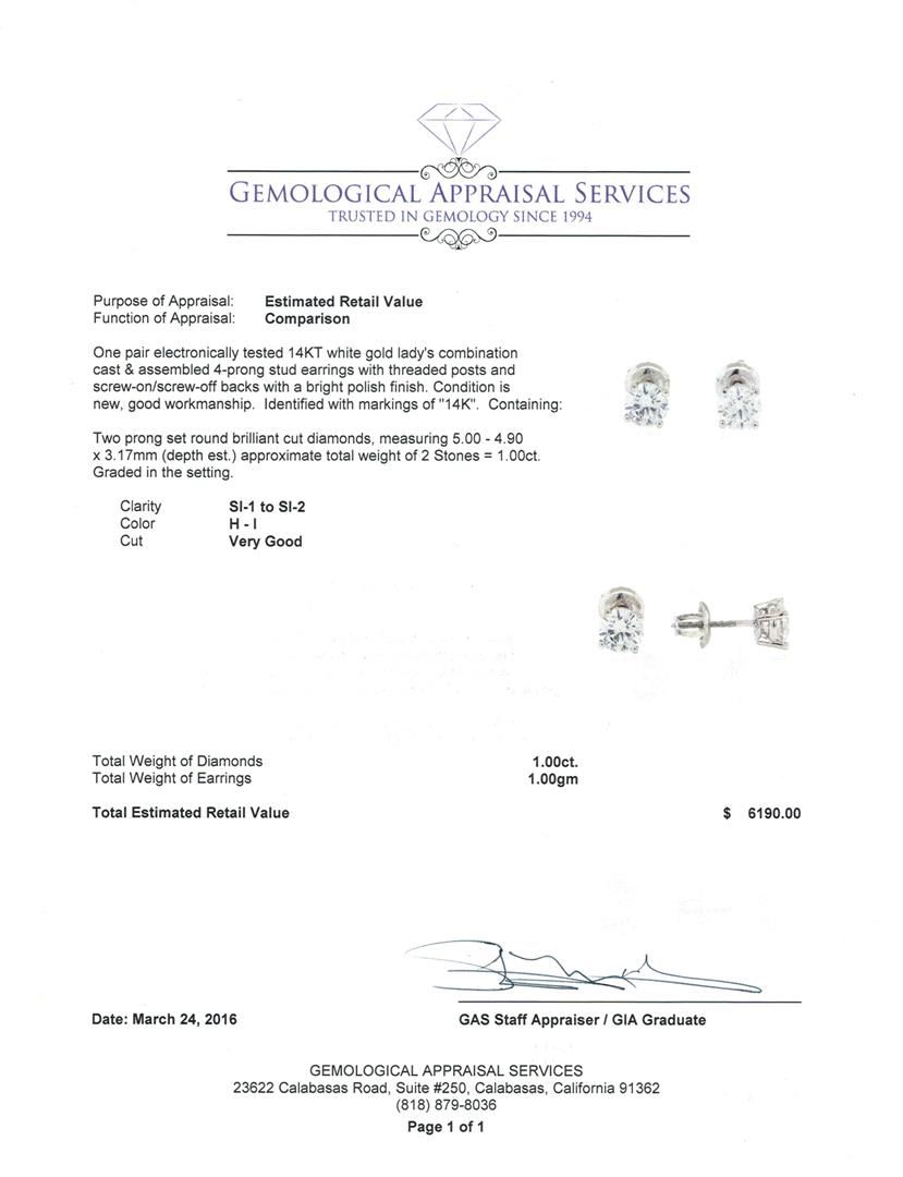One pair electronically tested 14KT white gold lady's combination cast & assembled 4-prong stud earrings with threaded posts and screw-on/screw-off backs with a bright polish finish. Identified with markings of "14K". Condition is new, good workmanship. Containing: Two prong set round brilliant cut diamonds, measuring 5.00 - 4.90 x 3.17mm (depth est.) approximate total weight of 2 Stones = 1.00ct. Graded in the setting. Clarity: SI-1 to SI-2. Color: H - I. Cut Very Good. Total Weight of Diamonds 1.00ct. Total Weight of Earrings 1.00gm. GAS Appraised at $6,190.00.