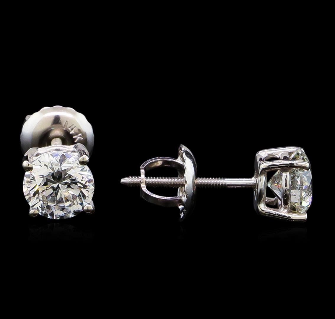 One pair electronically tested 14KT white gold lady's combination cast & assembled diamond stud earrings with threaded posts and screw-on/screw-off backs with a basket setting with a bright polish finish. Identified with markings of "14K". Condition is new, good workmanship. Containing: One prong set round brilliant cut diamond, measuring 5.06 - 5.04 x 3.13mm (depth est.) approximate weight of 0.50ct. Graded in the setting. Clarity: SI-3. Color: Very Good One prong set round brilliant cut diamond, measuring 5.03 - 5.01 x 3.17mm (depth est.) approximate weight of 0.50ct. Graded in the setting. Clarity: SI-3. Color: Very Good. Total Weight of Diamonds 1.00ct. Total Weight of Stud Earrings 1.00gm. GAS Appraised at $5,905.00.