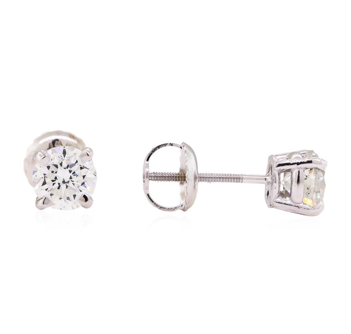 One pair electronically tested 14KT white gold lady's combination cast & assembled stud earrings with threaded posts and screw-on/screw-off backs with a bright polish finish. Identified with markings of "14K". Condition is new, good workmanship. Containing: Two prong set round brilliant cut diamonds, measuring 4.91 - 4.89 x 3.21mm (depth est.) , 5.00.%. GTCF approximate total weight of 2 Stones = 1.00ct. Graded in the setting. Clarity: SI-1 to I-1. Color: F - Good. Total Weight of Diamonds 1.00ct. Total Weight of Earrings 1.00gm. GAS Appraised at $6,790.00.
