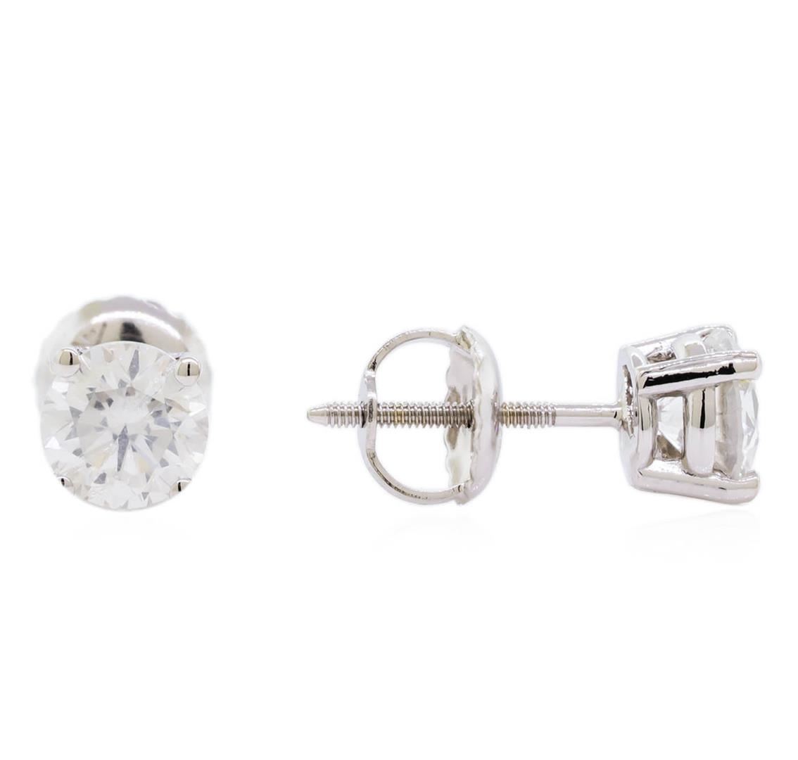 One pair electronically tested 14KT white gold lady's combination cast & assembled stud earrings with threaded posts and screw-on/screw-off backs with a bright polish finish. Identified with markings of "14K". Condition is new, good workmanship. Containing: Two prong set round brilliant cut diamonds, measuring 5.02 - 4.99 x 3.16mm (depth est.) approximate total weight of 2 Stones = 1.00ct. Graded in the setting. Clarity: SI-2 to I-1. Color: G. Cut Good. Total Weight of Diamonds 1.00ct. Total Weight of Earrings 1.00gm. GAS Appraised at $5,805.00.
