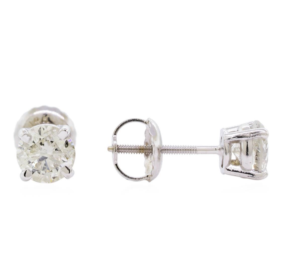 One pair electronically tested 14KT white gold lady's combination cast & assembled stud earrings with threaded posts and screw-on/screw-off backs with a bright polish finish. Identified with markings of "14K". Condition is new, good workmanship. Containing: Two prong set round brilliant cut diamonds, measuring 4.93 - 4.90 x 3.20mm (depth est.) , 5.00.%. GTCF approximate total weight of 2 Stones = 1.00ct. Graded in the setting. Clarity: SI-1 to I-1. Color: G - Good. Total Weight of Diamonds 1.00ct. Total Weight of Earrings 1.00gm. GAS Appraised at $6,505.00.