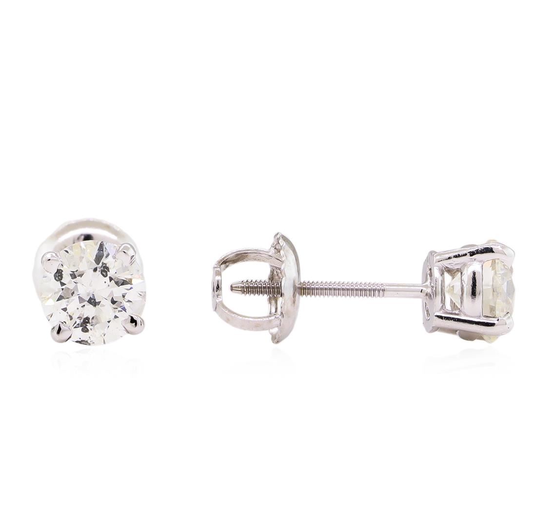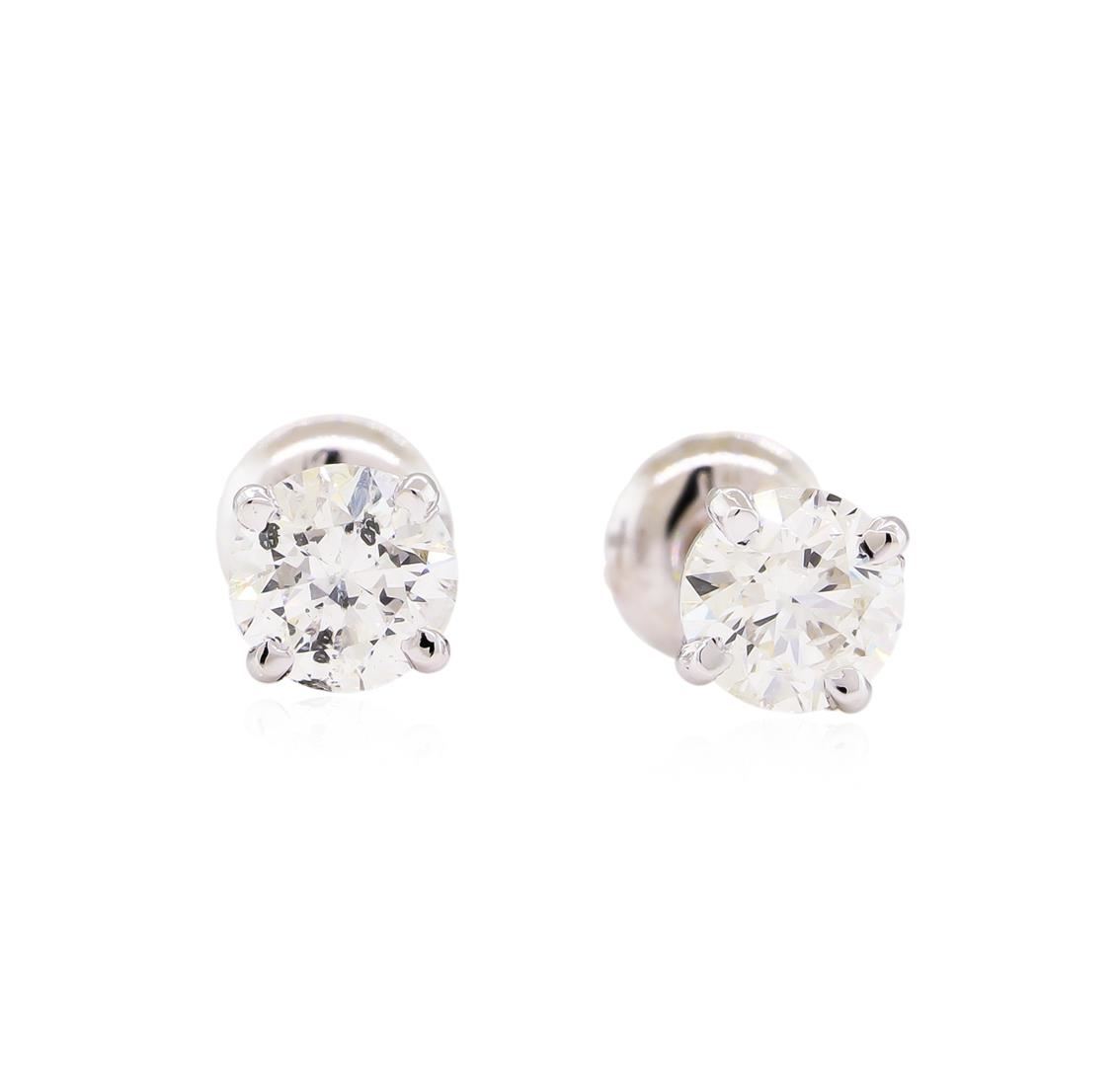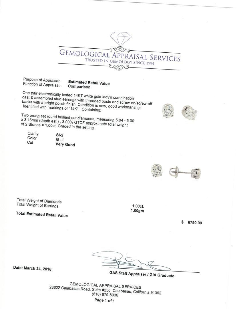 One pair electronically tested 14KT white gold lady's combination cast & assembled stud earrings with threaded posts and screw-on/screw-off backs with a bright polish finish. Identified with markings of "14K". Condition is new, good workmanship. Containing: Two prong set round brilliant cut diamonds, measuring 5.04 - 5.00 x 3.16mm (depth est.) , 3.00.%. GTCF approximate total weight of 2 Stones = 1.00ct. Graded in the setting. Clarity: SI-2. Color: G - I. Cut Very Good. Total Weight of Diamonds 1.00ct. Total Weight of Earrings 1.00gm. GAS Appraised at $6,790.00.