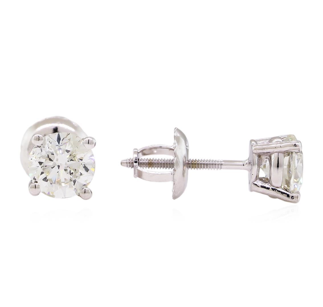 One pair electronically tested 14KT white gold lady's combination cast & assembled stud earrings with threaded posts and screw-on/screw-off backs with a bright polish finish. Identified with markings of "14K". Condition is new, good workmanship. Containing: Two prong set round brilliant cut diamonds, measuring 5.03 - 4.95 x 3.14mm (depth est.) , 5.00.%. GTCF approximate total weight of 2 Stones = 1.00ct. Graded in the setting. Clarity: SI-1 to SI-2. Color: H - I. Cut Very Good. Total Weight of Diamonds 1.00ct. Total Weight of Earrings 1.00gm. GAS Appraised at $7,390.00.