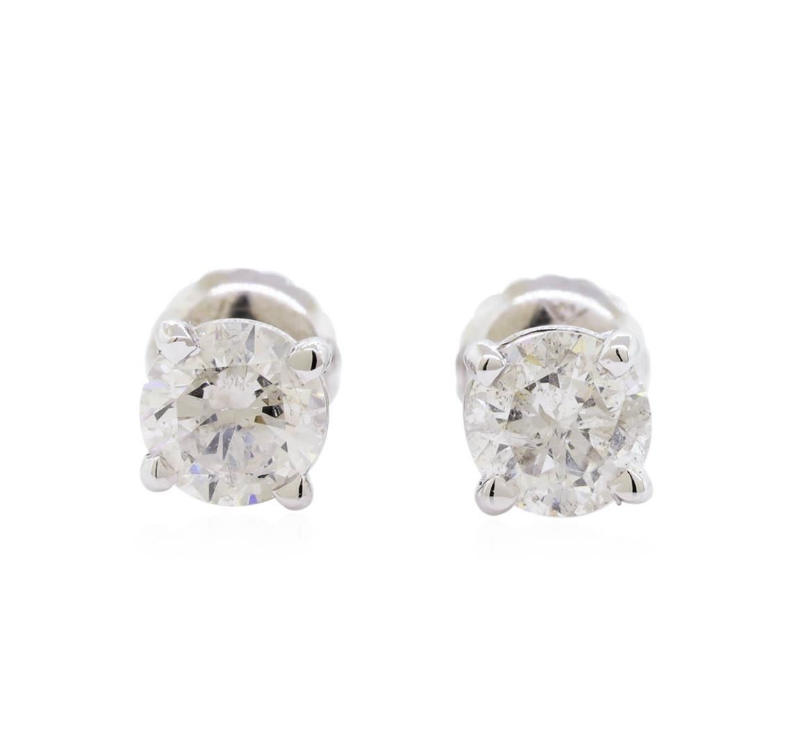 One pair electronically tested 14KT white gold lady's combination cast & assembled stud earrings with threaded posts and screw-on/screw-off backs with a bright polish finish. Identified with markings of "14K". Condition is new, good workmanship. Containing: Two prong set round brilliant cut diamonds, measuring 5.01 - 5.00 x 3.16mm (depth est.) approximate total weight of 2 Stones = 1.00ct. Graded in the setting. Clarity: SI-2 to I-1. Color: G - Good. Total Weight of Diamonds 1.00ct. Total Weight of Earrings 1.10gm. GAS Appraised at $6,520.00.