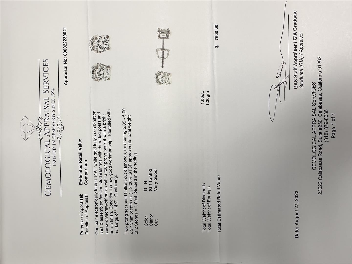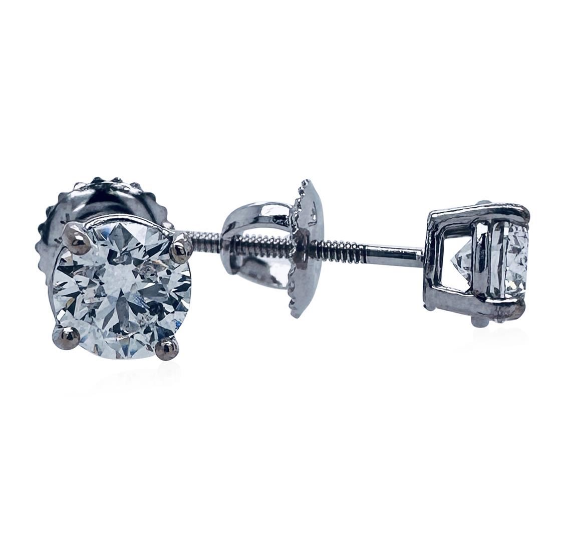 One pair electronically tested 14KT white gold lady's combination cast assembled fashion stud earrings with threaded posts and screw-on/screw-off backs with four prong basket with bright polish finish. Condition is new, good workmanship. Identified with markings of 14K. Containing: 2 prong set round brilliant cut diamonds, approximate total weight of 2 stones = 1.00 ctw. Graded in the setting. Total weight of Diamonds: 1.00 ctw. Total estimated retail value: $7500