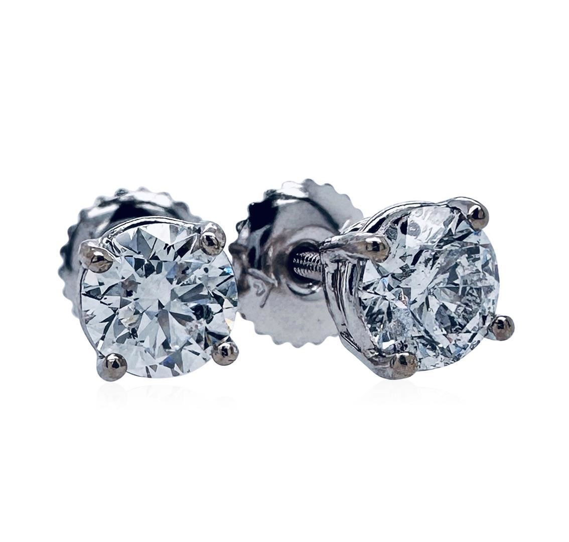 One pair electronically tested 14KT white gold lady's combination cast assembled fashion stud earrings with threaded posts and screw-on/screw-off backs with four prong basket with bright polish finish. Condition is new, good workmanship. Identified with markings of 14K. Containing: 2 prong set round brilliant cut diamonds, approximate total weight of 2 stones = 1.00 ctw. Graded in the setting. Total weight of Diamonds: 1.00 ctw. Total estimated retail value: $7500