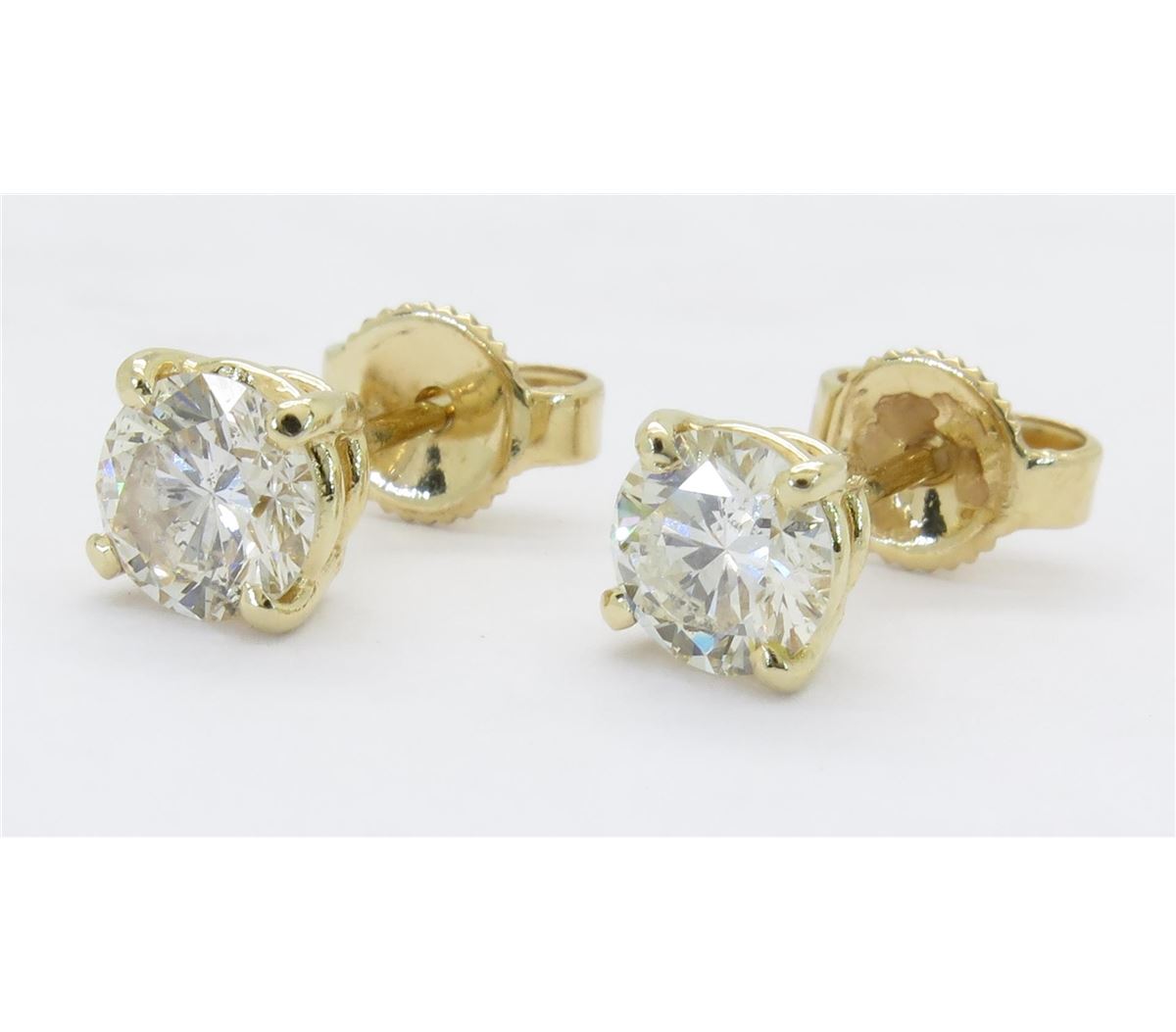 One tested 14K yellow gold pair of diamond earrings. Containing: Two Round Brilliant Cut Diamonds. Clarity: SI2-I1, Color: I-J. Approximate total diamond weight: 1.00CTW. Diamonds are graded in the mounting, unless otherwise stated. Weight: 1.2 grams.