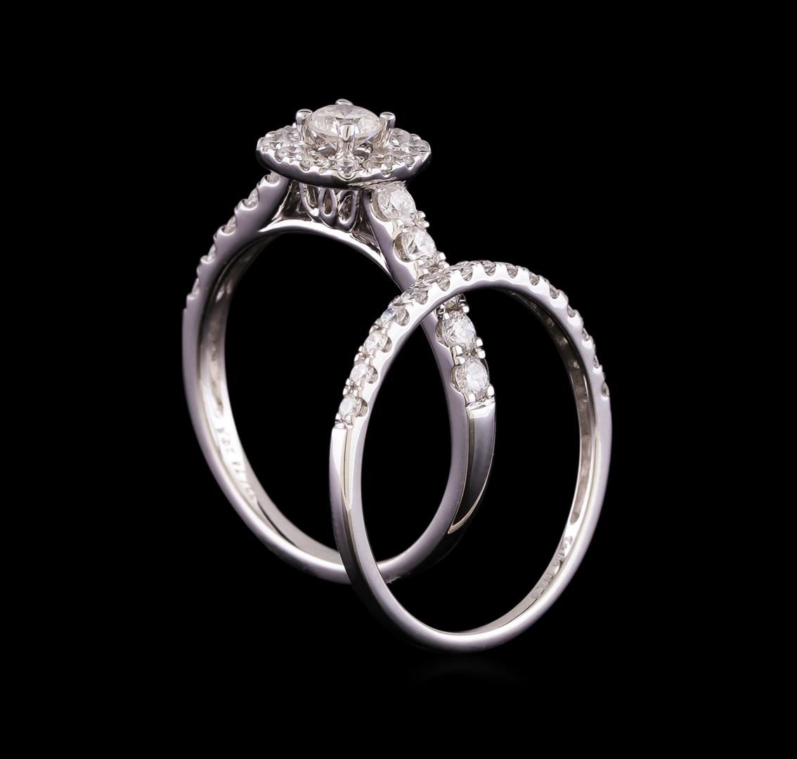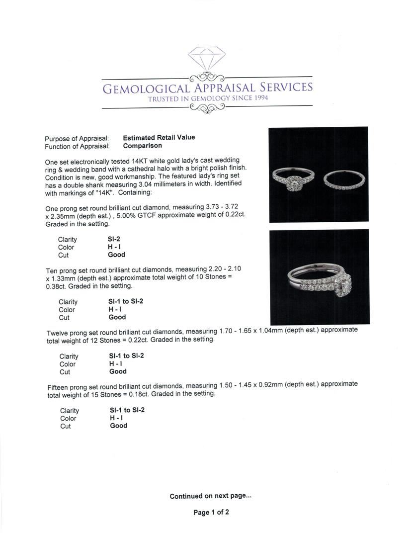 One set electronically tested 14KT white gold lady's cast wedding ring & wedding band with a cathedral halo with a bright polish finish. The featured lady's ring set has a double shank measuring 3.04 millimeters in width. Identified with markings of '14K'. Condition is new, good workmanship. Containing: One prong set round brilliant cut diamond, measuring 3.73 - 3.72 x 2.35mm (depth est.) , 5.00.%. GTCF approximate weight of 0.22ct. Graded in the setting. Clarity SI-2. Color: H - I Cut Good Ten prong set round brilliant cut diamonds, measuring 2.20 - 2.10 x 1.33mm (depth est.) approximate total weight of 10 Stones = 0.38ct. Graded in the setting. Clarity SI-1 to SI-2. Color: H - I Cut Good Twelve prong set round brilliant cut diamonds, measuring 1.70 - 1.65 x 1.04mm (depth est.) approximate total weight of 12 Stones = 0.22ct. Graded in the setting. Clarity SI-1 to SI-2. Color: H - I Cut Good Fifteen prong set round brilliant cut diamonds, measuring 1.50 - 1.45 x 0.92mm (depth est.) approximate total weight of 15 Stones = 0.18ct. Graded in the setting. Clarity SI-1 to SI-2. Color: H - I Cut Good. Total Weight of Diamonds 1.00ct.. Total Weight of Ring & Wedding Band 3.40gm. GAS Appraised at $3,130.00.