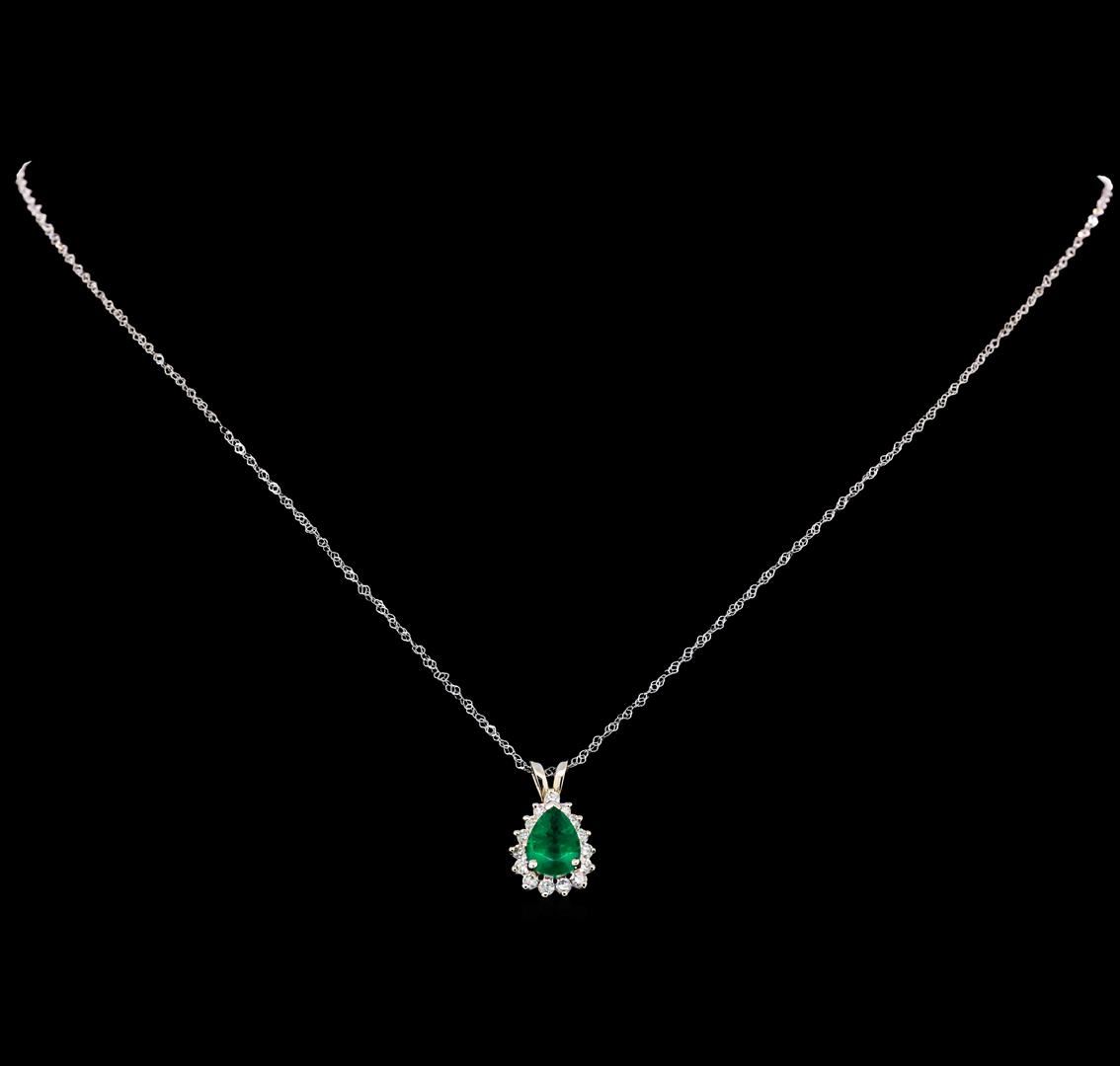 One electronically tested 18KT white gold ladies cast & assembled emerald and diamond pendant with chain. The pendant features an emerald set within a diamond floret completed by a butterfly bail. The pendant is supported by an eighteen inch length 18KT white gold designer style chain, terminating in a spring ring clasp. Bright polish finish. Trademark is GB. Identified with markings of '18K'. Condition is good. Containing: One prong set pear mixed cut natural emerald, measuring 8.00 x 6.10 x 4.00mm, approximate weight of 1.00ct., clarity is moderately included, type III, medium dark, moderately strong, very slightly bluish green color, (GIA vslbG 6/4), cut is good. Transmitting light with a minimum of distortion, transparent. Naturally occurring internal & external characteristics are present. Indications of oil residue. Graded in the setting. Fifteen prong set round brilliant cut diamonds, measuring 1.80 - 1.70 x 1.05mm (depth est.) approximate total weight of 15 Stones = 0.32ct. Graded in the setting. Clarity SI-1 to I-1. Color: E - G. Total Weight of Colored Stones 1.00ct.. Total Weight of Diamonds 0.32ct.. Total Weight of Pendant With Chain 3.42gm. AIG Appraised at $5,360.00.
