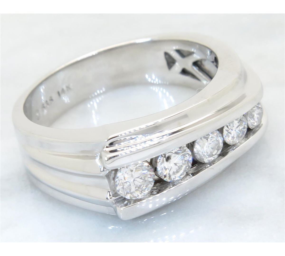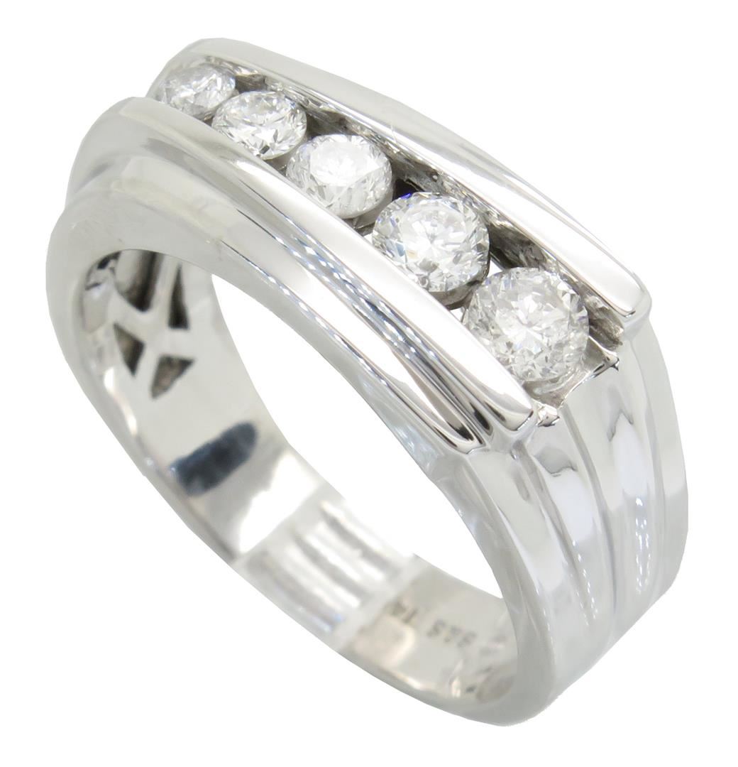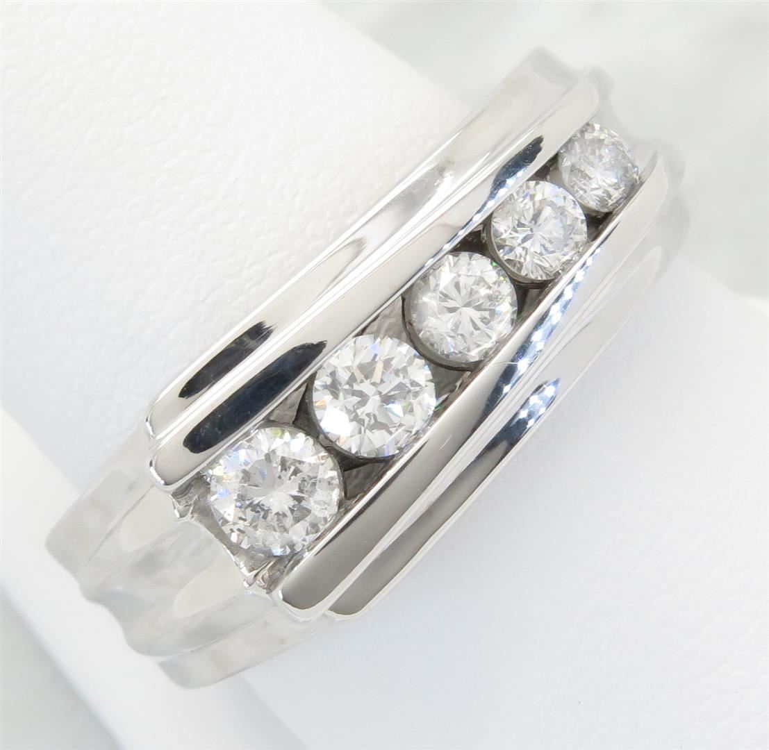 One tested 14K white gold diamond ring. Containing: Five Round Brilliant Cut Diamonds. Clarity: I, Color: G-H. Approximate total diamond weight: 1.00CTW. All diamonds are graded in the mounting unless otherwise stated. Weight of ring: 10.1 grams, Size: 11.