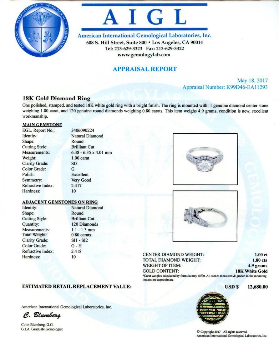1.00ct SI3 CLARITY CENTER Diamond 18K White Gold Ring (1.80ctw Diamonds) EGL CERTIFIED. One polished, stamped, and tested 18K white gold ring with a bright finish. The ring is mounted with: I genuine diamond center stone weighing 1.00 carat, and 120 genuine round diamonds weighing 0.80 carats. This item weighs 4.9 grams, condition is new, excellent workmanship. MAIN GEMSTONE EGL. Report No.: 3406090224 Identity: Natural Diamond Shape: Round Cutting Style: Brilliant Cut Measurements: 6.38 - 6.35 x 4.01 mm Weight: 1.00 carat Clarity Grade: SI-3 Color Grade: G Polish: Excellent Symmetry: Very Good Refractive Index: 2.417 Hardness: 10 ADJACENT GEMSTONES ON RING Identity: Natural Diamond Shape: Round Cutting Style: Brilliant Cut Quantity: 120 Diamonds Measurements: 1.1 - 1.3 mm Total Weight: 0.80 carats Clarity Grade: SI-1 to SI-2 Color Grade: G - H Refractive Index: 2.418 Hardness: 10 CENTER DIAMOND WEIGHT: 1.00 ct TOTAL DIAMOND WEIGHT: 1.80 cts WEIGHT OF ITEM: 4.9 grams GOLD CONTENT: 18K White Gold