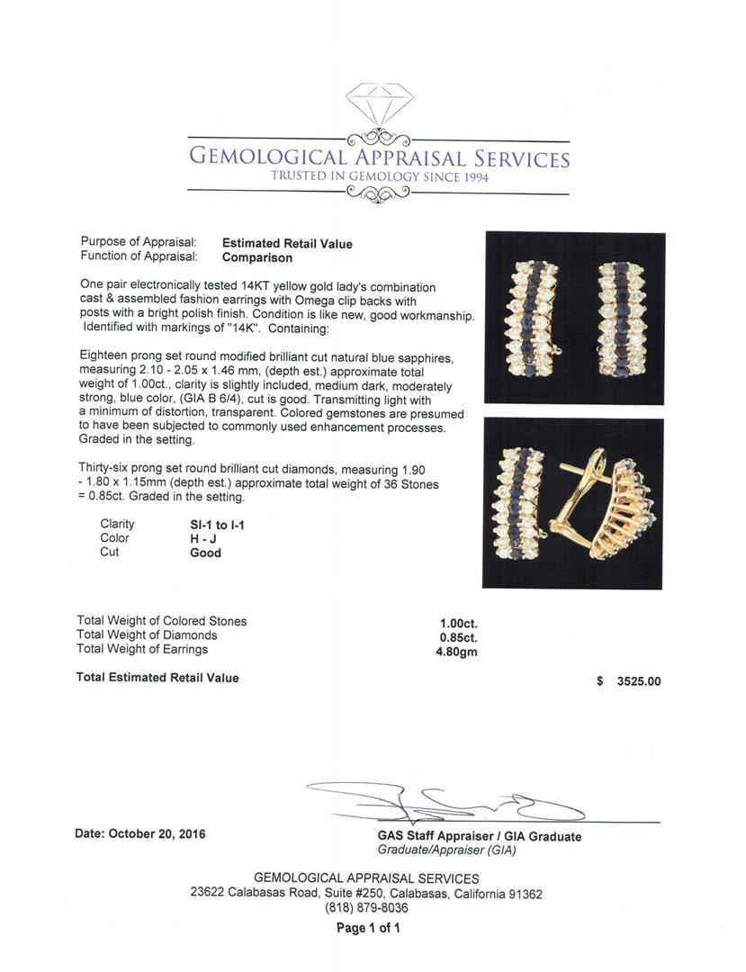One pair electronically tested 14KT yellow gold lady's combination cast & assembled fashion earrings with Omega clip backs with posts with a bright polish finish. Identified with markings of '14K'. Condition is like new, good workmanship. Containing: Eighteen prong set round modified brilliant cut natural blue sapphires, measuring 2.10 - 2.05 x 1.46 mm, (depth est.) approximate total weight of 1.00ct., clarity is slightly included, medium dark, moderately strong, blue color, (GIA B 6/4), cut is good. Transmitting light with a minimum of distortion, transparent. Colored gemstones are presumed to have been subjected to commonly used enhancement processes. Graded in the setting. Thirty-Six prong set round brilliant cut diamonds, measuring 1.90 - 1.80 x 1.15mm (depth est.) approximate total weight of 36 Stones = 0.85ct. Graded in the setting. Clarity SI-1 to I-1. Color: H - J Cut Good. Total Weight of Colored Stones 1.00ct.. Total Weight of Diamonds 0.85ct.. Total Weight of Earrings 4.80gm. GAS Appraised at $3,525.00.