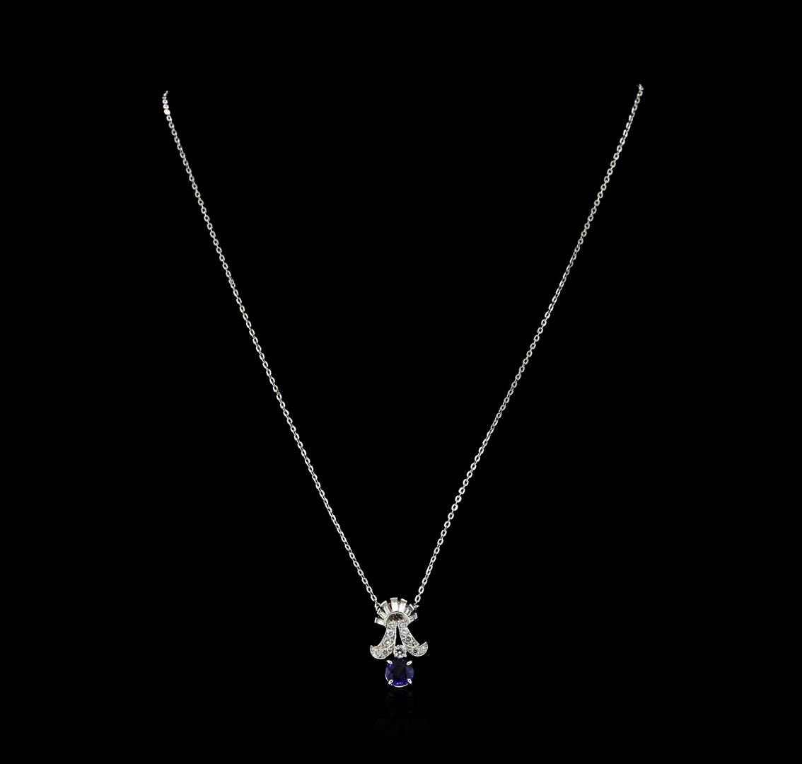 One electronically tested platinum & 14KT white gold ladies cast & assembled sapphire and diamond pendant with chain. The platinum pendant features a free hanging sapphire under a diamond set stylized umbrella, completed by a hidden bail. The pendant is supported by a 14KT white gold chain, terminating in a platinum spring ring clasp. Bright polish finish. Condition is good. Containing: One prong set round mixed cut natural blue sapphire, measuring 6.20 - 6.20 x 3.20 mm, approximate weight of 1.00ct., clarity is slightly included, type II, medium dark, very slightly grayish, blue color, (GIA B 6/3), cut is good. Transmitting light with a minimum of distortion, transparent. Naturally occurring internal & external characteristics are present. Graded in the setting. One prong set round brilliant cut diamond, measuring 2.90 - 2.90 x 1.74mm (depth est.) approximate weight of 0.09ct. Graded in the setting. Clarity I-1. Color: G Ten prong set round brilliant cut diamonds, measuring 1.90 - 1.60 x 1.05mm (depth est.) approximate total weight of 10 Stones = 0.20ct. Graded in the setting. Clarity VS-1 to SI-1. Color: G - H Seven prong set baguette cut (tapered) diamonds, measuring from 2.00 x 1.20 x 0.84mm (depth est.) to 3.00 x 1.30 x 0.91mm (depth est.) approximate total weight of 7 Stones = 0.18ct. Graded in the setting. Clarity VS-1 to SI-1. Color: G - H. Total Weight of Colored Stones 1.00ct.. Total Weight of Diamonds 0.47ct.. Total Weight of Pendant With Chain 5.47gm. AIG Appraised at $3,860.00.