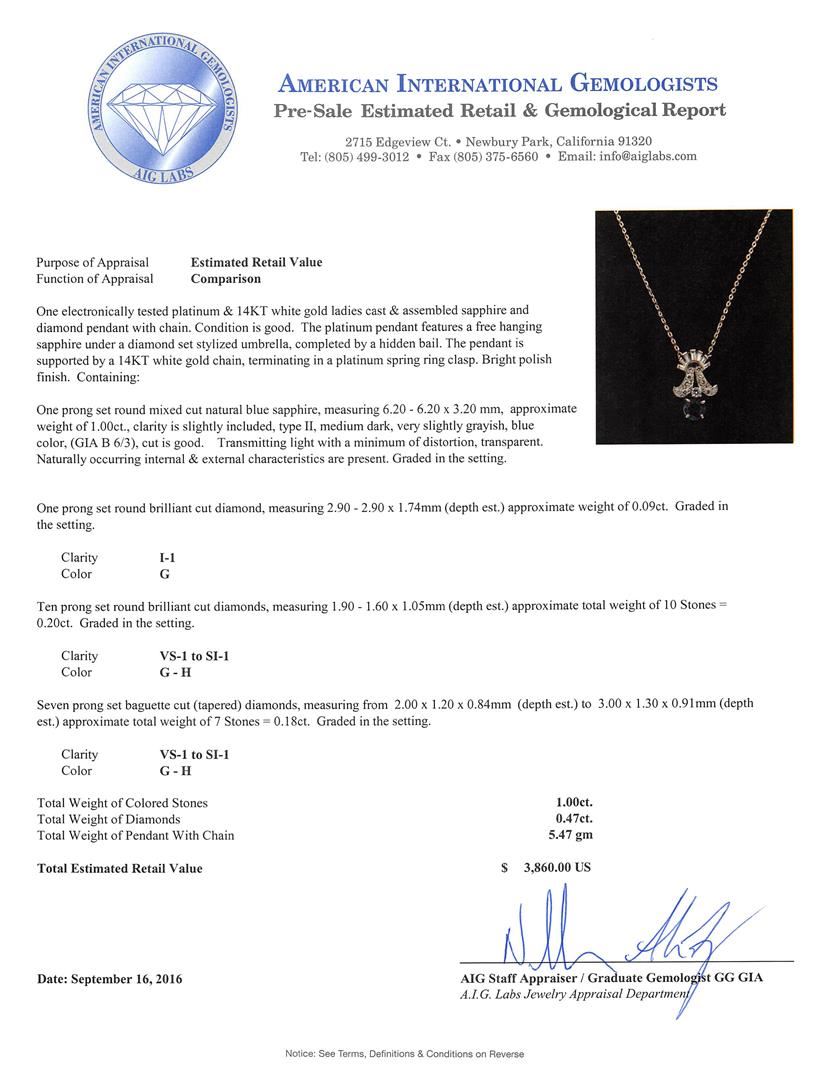 One electronically tested platinum & 14KT white gold ladies cast & assembled sapphire and diamond pendant with chain. The platinum pendant features a free hanging sapphire under a diamond set stylized umbrella, completed by a hidden bail. The pendant is supported by a 14KT white gold chain, terminating in a platinum spring ring clasp. Bright polish finish. Condition is good. Containing: One prong set round mixed cut natural blue sapphire, measuring 6.20 - 6.20 x 3.20 mm, approximate weight of 1.00ct., clarity is slightly included, type II, medium dark, very slightly grayish, blue color, (GIA B 6/3), cut is good. Transmitting light with a minimum of distortion, transparent. Naturally occurring internal & external characteristics are present. Graded in the setting. One prong set round brilliant cut diamond, measuring 2.90 - 2.90 x 1.74mm (depth est.) approximate weight of 0.09ct. Graded in the setting. Clarity I-1. Color: G Ten prong set round brilliant cut diamonds, measuring 1.90 - 1.60 x 1.05mm (depth est.) approximate total weight of 10 Stones = 0.20ct. Graded in the setting. Clarity VS-1 to SI-1. Color: G - H Seven prong set baguette cut (tapered) diamonds, measuring from 2.00 x 1.20 x 0.84mm (depth est.) to 3.00 x 1.30 x 0.91mm (depth est.) approximate total weight of 7 Stones = 0.18ct. Graded in the setting. Clarity VS-1 to SI-1. Color: G - H. Total Weight of Colored Stones 1.00ct.. Total Weight of Diamonds 0.47ct.. Total Weight of Pendant With Chain 5.47gm. AIG Appraised at $3,860.00.