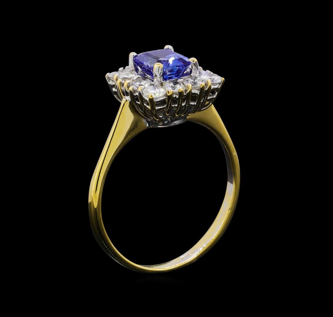 One electronically tested 14KT white gold ladies cast sapphire and diamond ring. The featured sapphire is set within a diamond bezel supported by a ribbed under gallery, completed by a one and one-half millimeter wide band. Bright polish finish with yellow gold overlay. Identified with markings of "14K". Condition is good. Containing: One prong set emerald step cut natural blue sapphire, measuring 6.00 x 4.90 x 3.60mm, approximate weight of 1.00ct., clarity is slightly included, type II, medium, very slightly grayish, violetish blue color, (GIA vB 5/3), cut is good. Transmitting light with a minimum of distortion, transparent. Naturally occurring internal & external characteristics are present. Graded in the setting. Twelve prong set round brilliant cut diamonds, measuring 2.50 - 2.20 x 1.41mm (depth est.) approximate total weight of 12 Stones = 0.60ct. The clarity grade reflects the average range of clarity for this group. Graded in the setting. Clarity: VS-1 to SI-2. Color: F - H. Total Weight of Colored Stones 1.00ct. Total Weight of Diamonds 0.60ct. Total Weight of Ring 3.33gm. AIG Appraised at $4,025.00.