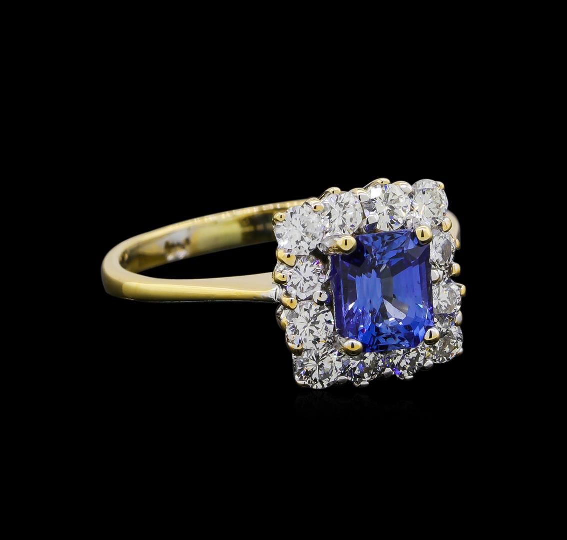 One electronically tested 14KT white gold ladies cast sapphire and diamond ring. The featured sapphire is set within a diamond bezel supported by a ribbed under gallery, completed by a one and one-half millimeter wide band. Bright polish finish with yellow gold overlay. Identified with markings of "14K". Condition is good. Containing: One prong set emerald step cut natural blue sapphire, measuring 6.00 x 4.90 x 3.60mm, approximate weight of 1.00ct., clarity is slightly included, type II, medium, very slightly grayish, violetish blue color, (GIA vB 5/3), cut is good. Transmitting light with a minimum of distortion, transparent. Naturally occurring internal & external characteristics are present. Graded in the setting. Twelve prong set round brilliant cut diamonds, measuring 2.50 - 2.20 x 1.41mm (depth est.) approximate total weight of 12 Stones = 0.60ct. The clarity grade reflects the average range of clarity for this group. Graded in the setting. Clarity: VS-1 to SI-2. Color: F - H. Total Weight of Colored Stones 1.00ct. Total Weight of Diamonds 0.60ct. Total Weight of Ring 3.33gm. AIG Appraised at $4,025.00.