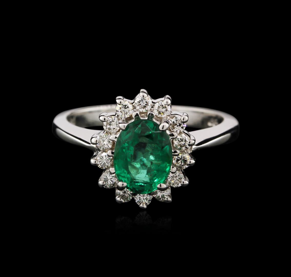 One electronically tested 18KT white gold ladies cast emerald and diamond ring with a bright polish finish. Identified with markings of "18K". Condition is new. Containing: One prong set oval modified brilliant cut natural emerald, measuring 8.00 x 6.00 x 3.90mm, stated weight of 1.00ct., clarity is moderately included, type III, medium, moderately strong, green color, (GIA G 5/4), cut is good. Fourteen prong set round brilliant cut diamonds, measuring 1.70 - 1.70 x 1.02mm (depth est.) approximate total weight of 14 Stones = 0.37ct. Clarity: SI-1. Color: J - K, Cut is Good. Colored gemstones are presumed to have been subjected to commonly used enhancement processes. All diamonds and colored gemstones are graded in the mounting, unless otherwise stated. Total Weight of Colored Stones 1.00ct. Total Weight of Diamonds 0.37ct. Total Weight of Ring 5.50 grams. GGL Appraised at $3,060.00.