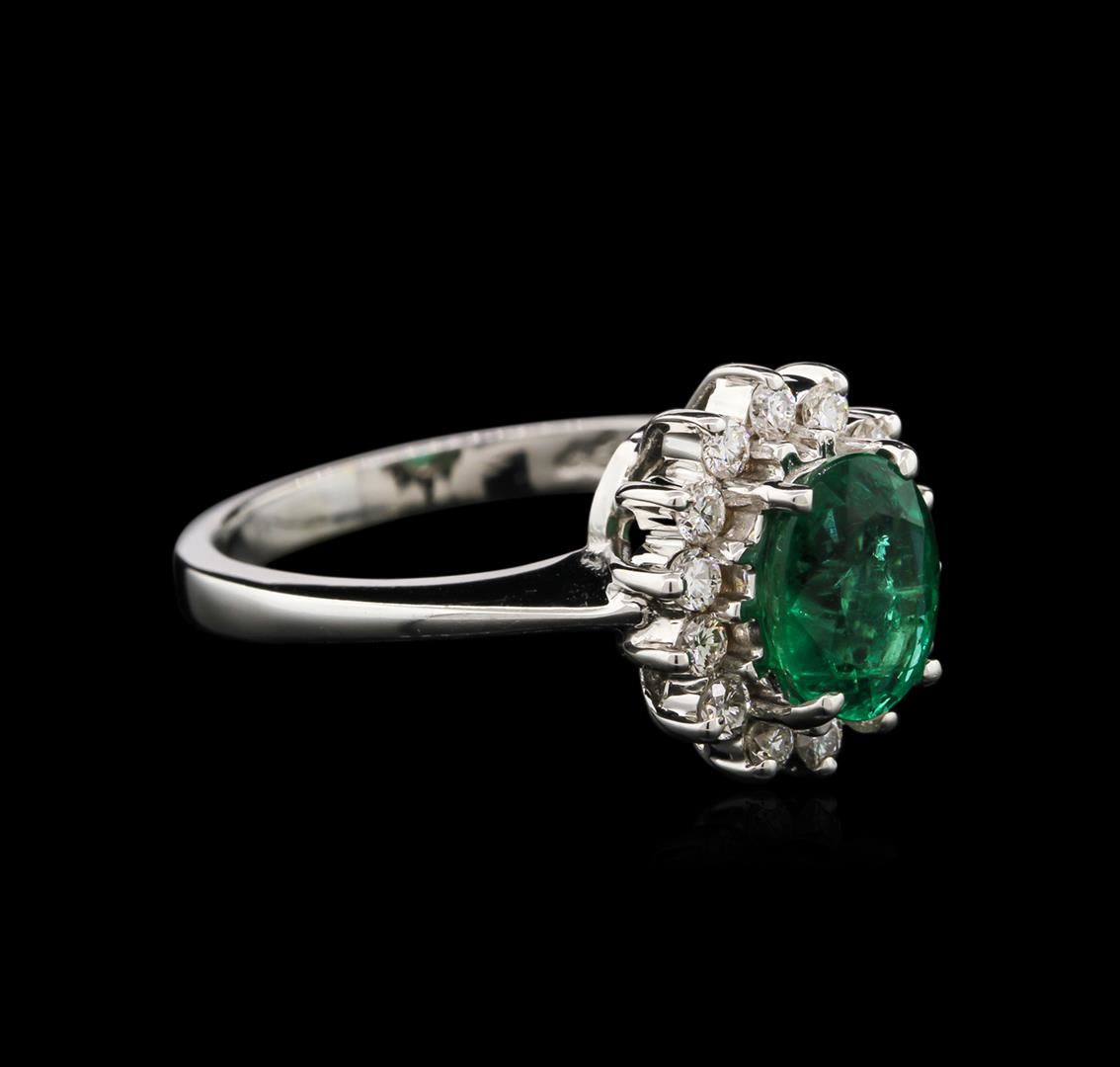 One electronically tested 18KT white gold ladies cast emerald and diamond ring with a bright polish finish. Identified with markings of "18K". Condition is new. Containing: One prong set oval modified brilliant cut natural emerald, measuring 8.00 x 6.00 x 3.90mm, stated weight of 1.00ct., clarity is moderately included, type III, medium, moderately strong, green color, (GIA G 5/4), cut is good. Fourteen prong set round brilliant cut diamonds, measuring 1.70 - 1.70 x 1.02mm (depth est.) approximate total weight of 14 Stones = 0.37ct. Clarity: SI-1. Color: J - K, Cut is Good. Colored gemstones are presumed to have been subjected to commonly used enhancement processes. All diamonds and colored gemstones are graded in the mounting, unless otherwise stated. Total Weight of Colored Stones 1.00ct. Total Weight of Diamonds 0.37ct. Total Weight of Ring 5.50 grams. GGL Appraised at $3,060.00.
