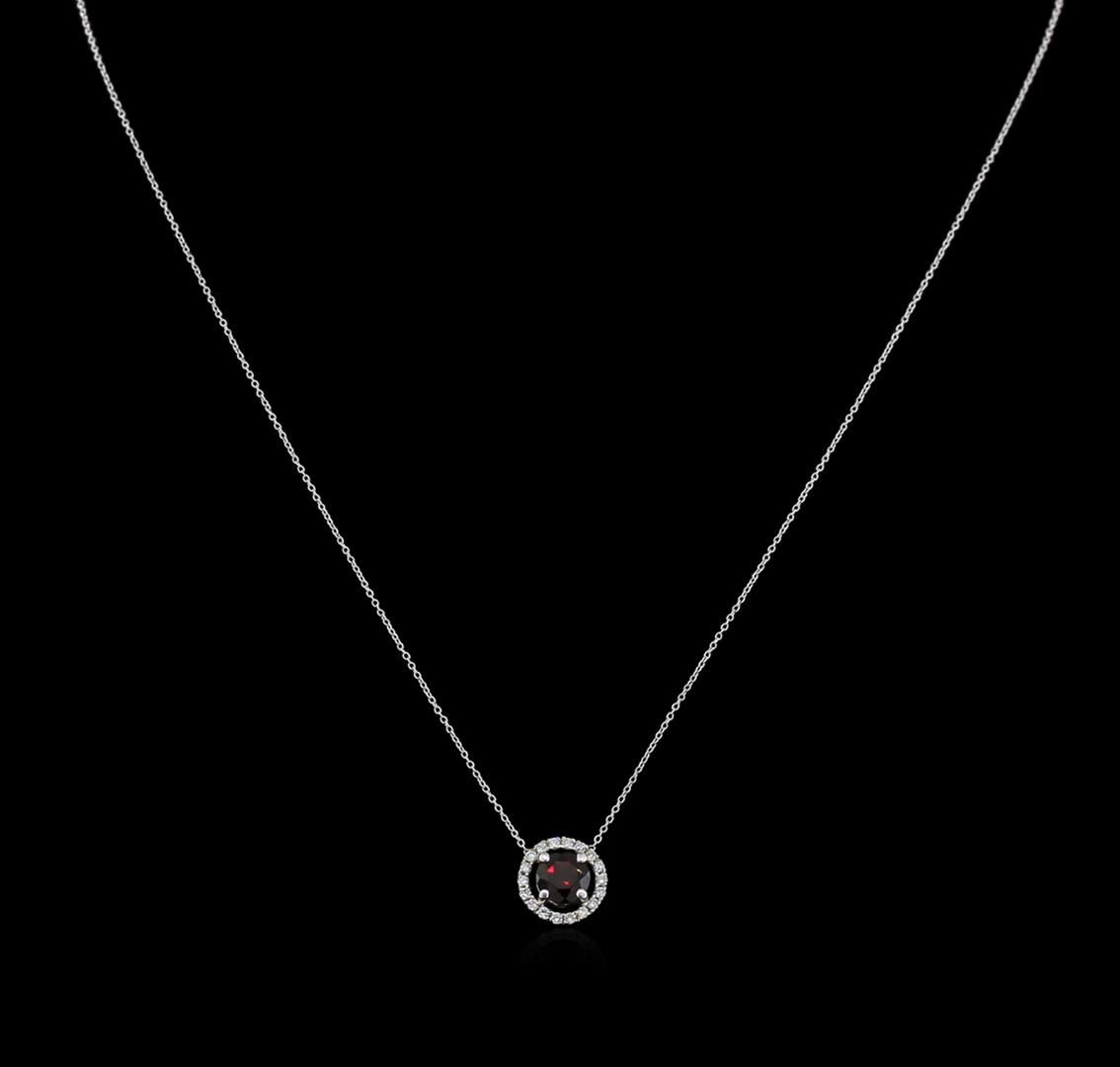 One pendant with chain featuring: 14KT white gold weighing 1.80 grams containing one prong set round cut rhodolite garnet center stone with a total weight of 1.00ct and pave set round diamonds with a total weight of 0.10ct.