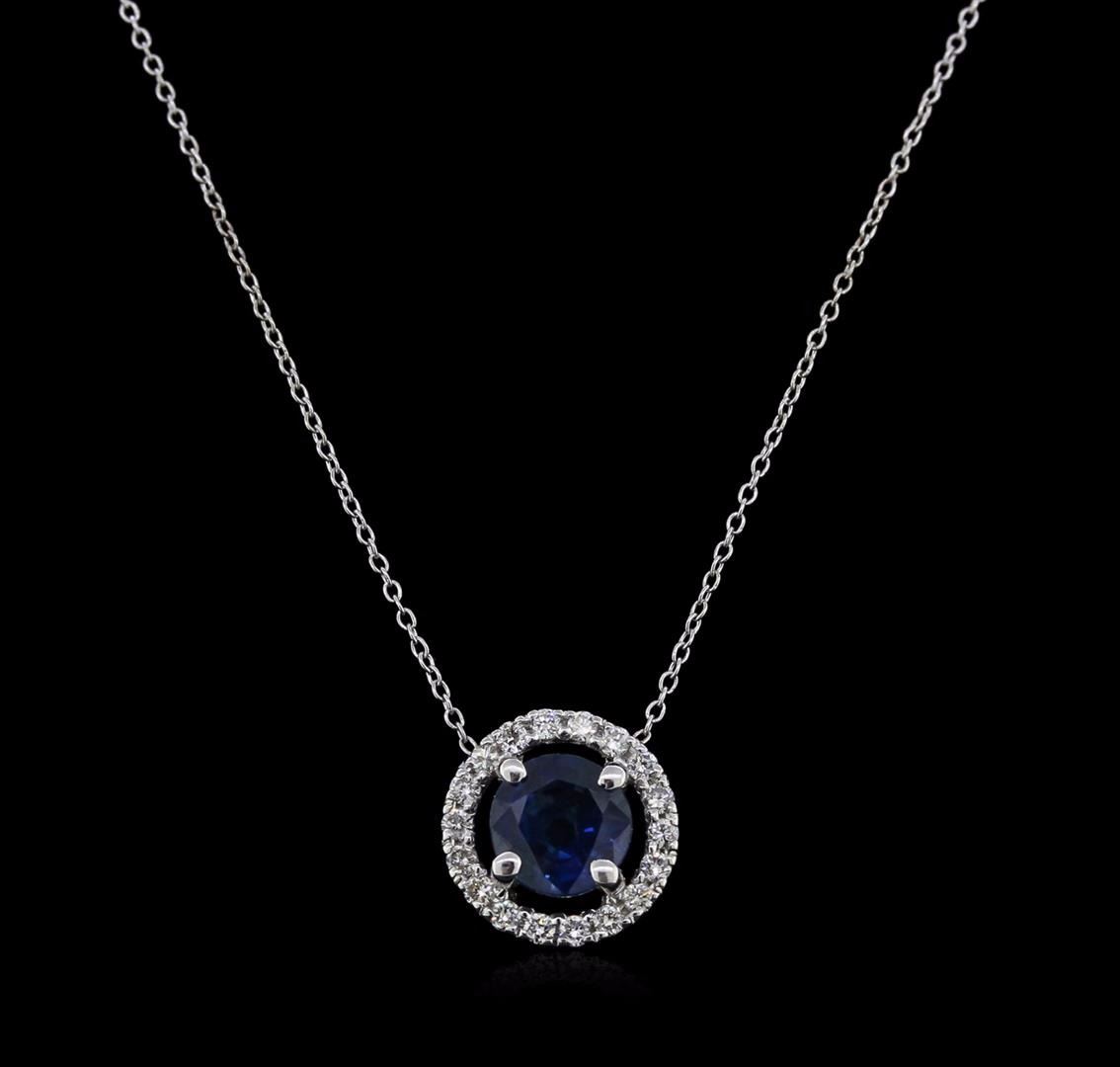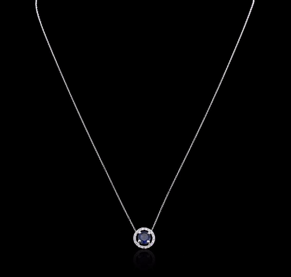 One pendant with chain featuring: 14KT white gold weighing 1.70 grams containing one prong set round cut blue sapphire center stone with a total weight of 1.00ct and pave set round diamonds with a total weight of 0.10ct.
