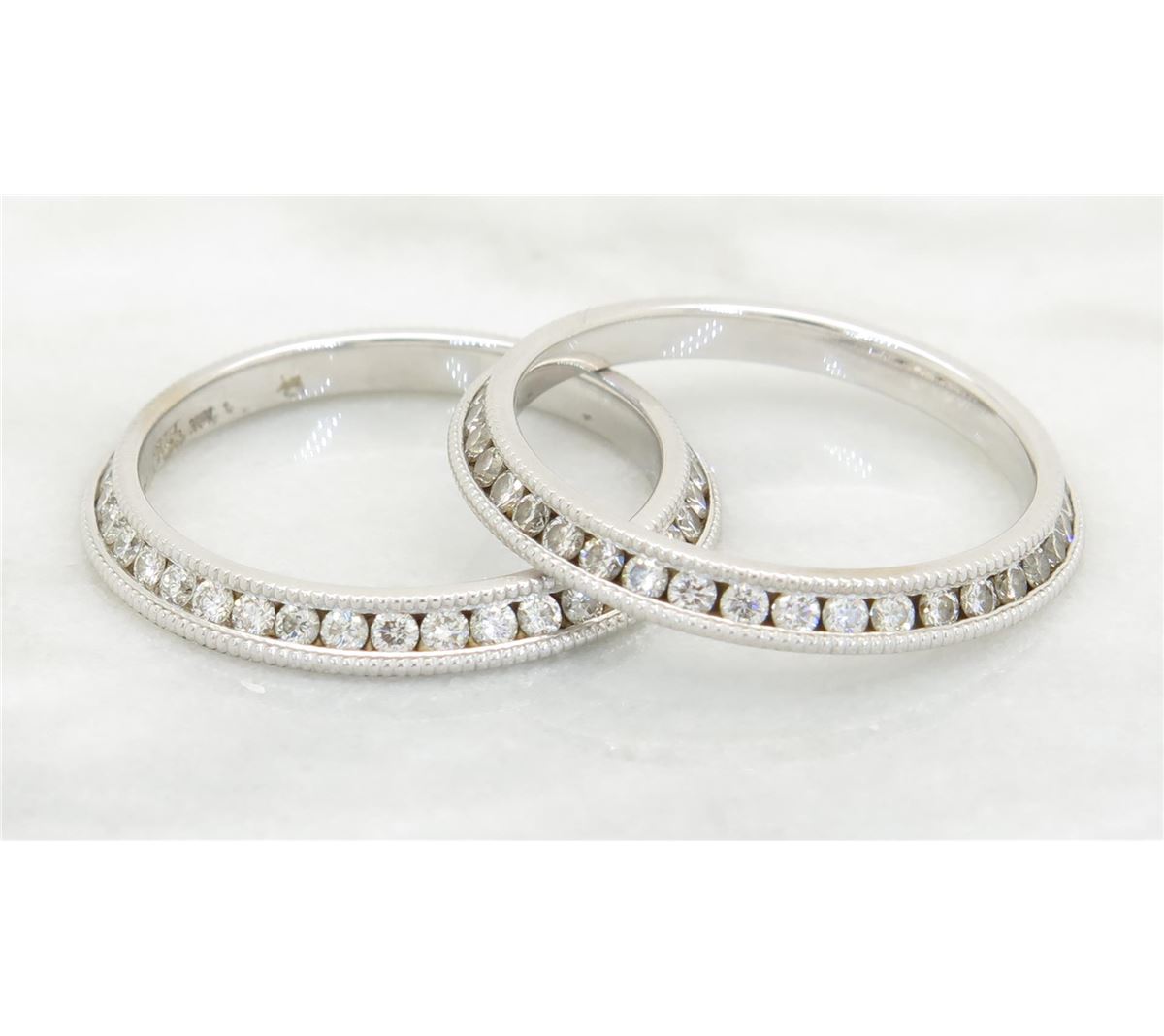Two tested 18K white gold diamond rings. Containing: 76 Round Brilliant Cut Diamonds. Clarity: SI, Color: G-I. Approximate total diamond weight: 1.00CTW. All diamonds are graded in the mounting unless otherwise stated. Weight of rings: 3.9 grams, Size: 5.75. The rings were designed to be worn next to each other or used as guards around another ring.