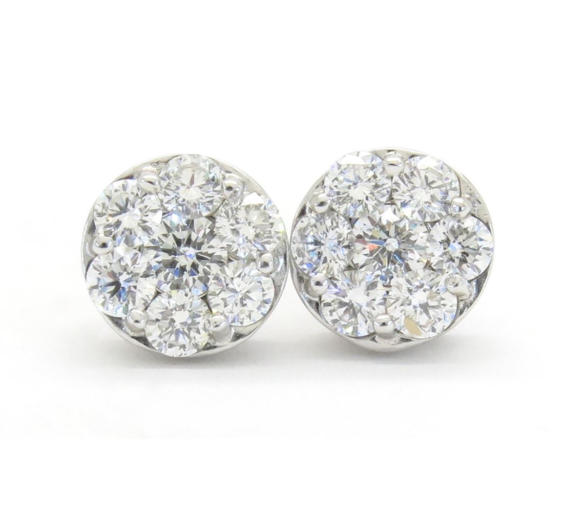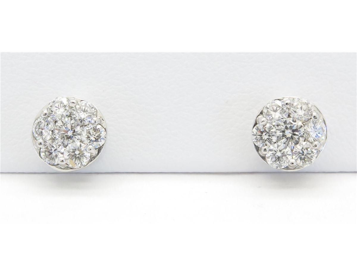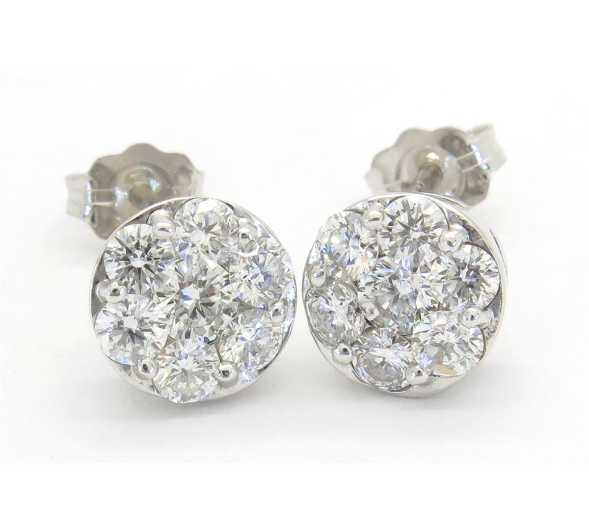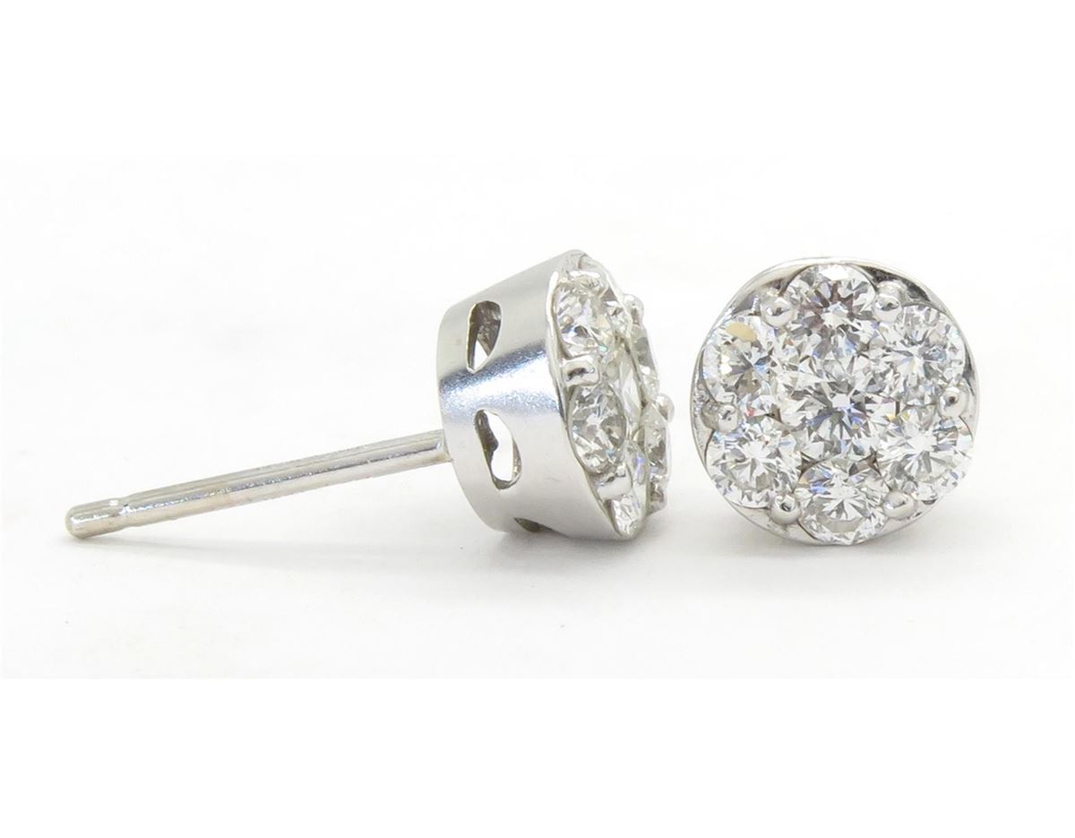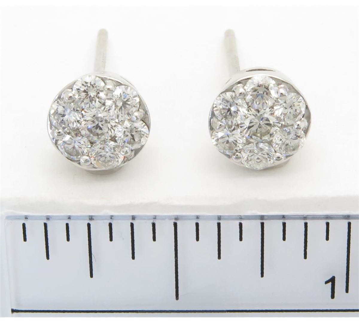 Two tested 14K white gold diamond earrings. Containing: 14 Round Brilliant Cut Diamonds. Clarity: I-SI, Color: G-H. Approximate total diamond weight: 1CTW. All diamonds are graded in the mounting unless otherwise stated. Weight of earrings: 2.0 grams.