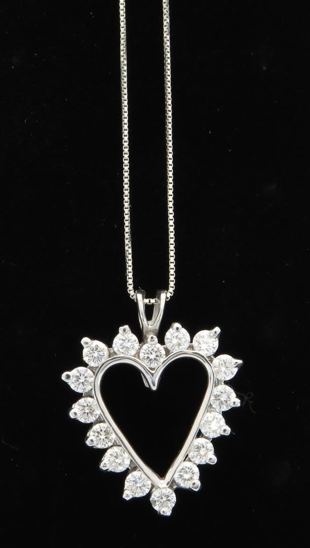 One tested 14K white gold diamond heart pendant with chain. Containing: 16 Round Brilliant Cut Diamonds. Clarity: I-SI, Color: G-H. Approximate total diamond weight: 1.00CTW. Diamonds are graded in the mounting, unless otherwise stated. Weight: 3.9 grams, Size of chain: 18".