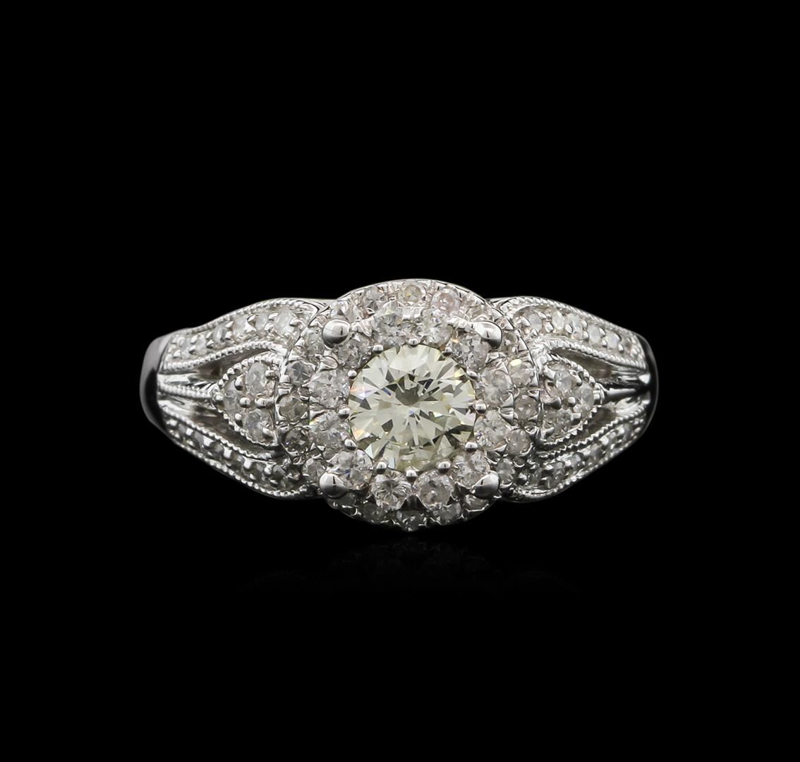 One electronically tested 14KT white gold lady's combination cast & assembled ring with a bright polish with milgrain detailing finish. The featured lady's ring has a double halo motif with a 2.1 millimeter wide shank. Identified with markings of "14K". Condition is new, good workmanship. Containing: One prong set round brilliant cut diamond, measuring 5.10 - 4.95 x 3.27mm (depth est.) approximate weight of 0.50ct. Graded in the setting. Clarity: SI-2. Color: K. Cut Good Eighteen prong set round brilliant cut diamonds, measuring 1.60 - 1.40 x 0.90mm (depth est.) approximate. Total Weight of 18 Stones = 0.24ct. Graded in the setting. Clarity: SI-2 to I-1. Color: H - I. Cut Good Forty-Four shared prong set single cut diamonds, measuring 1.20 - 1.10 x 0.75mm (depth est.) approximate. Total Weight of 44 Stones = 0.26ct. Graded in the setting. Clarity: SI-2 to I-1. Color: G - I. Cut Good. Total Weight of Diamonds 1.00ct. Total Weight of Ring 5.30gm. GAS Appraised at $7,035.00.