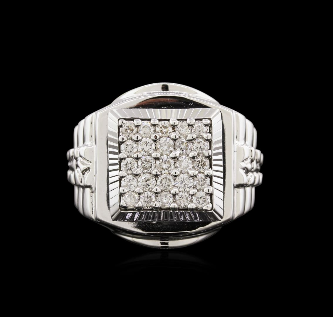 One electronically tested 14KT white gold man's combination cast & assembled cluster ring with a bright polish finish. Condition is new. The mens ring features a square top with fluted bezel. Identified with markings of "14K". Containing: Twenty-five prong set round brilliant cut diamonds, measuring 2.30 - 2.25 x 1.37mm (depth est.) approximate total weight of 25 Stones = 1.00ct. Graded in the setting. Clarity: SI-1 to I-1. Color: G - I. Cut: Good. Total Weight of Diamonds: 1.00ct. Total Weight of Ring: 18.20 gm. GAS Appraised at $6,990.00.