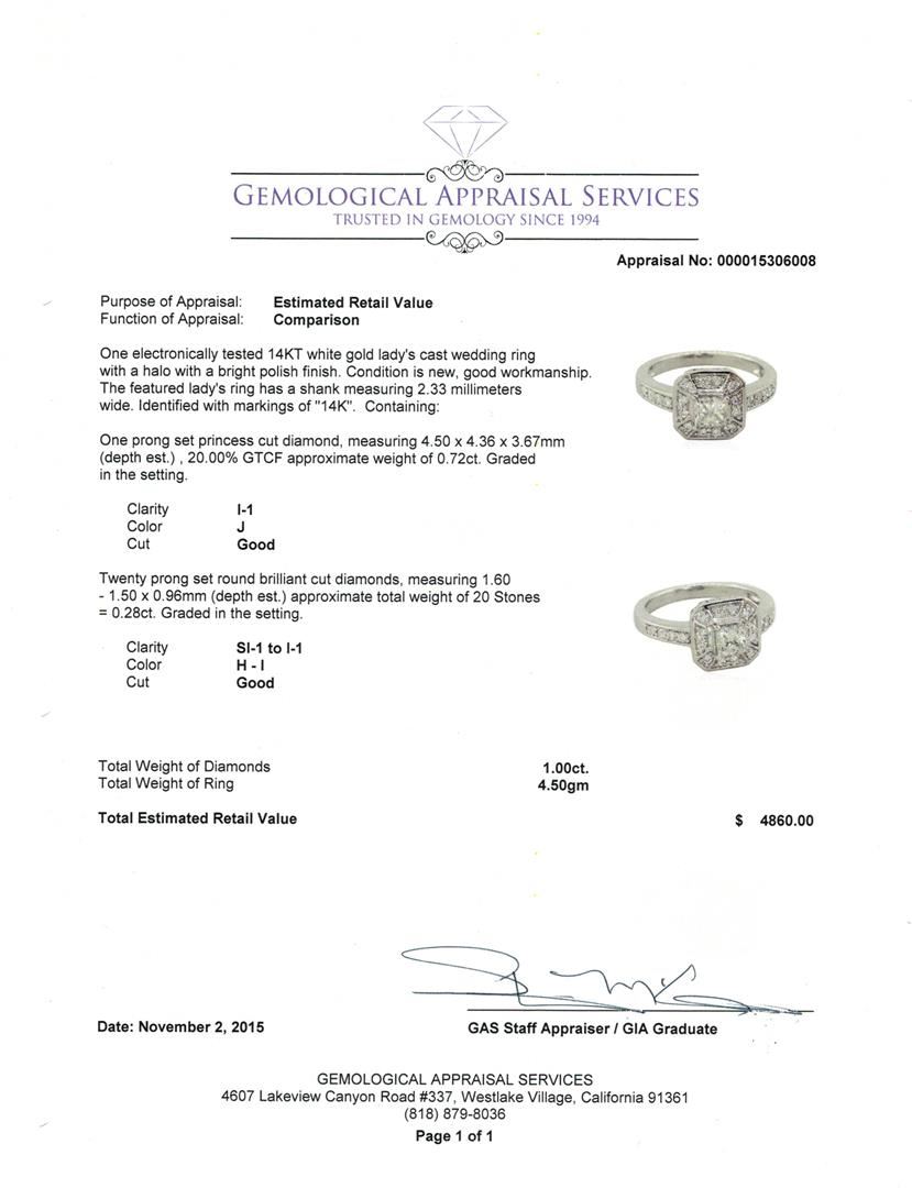 One electronically tested 14KT white gold lady's cast wedding ring with a halo with a bright polish finish. The featured lady's ring has a shank measuring 2.33 millimeters wide. Identified with markings of "14K". Condition is new, good workmanship. Containing: One prong set princess cut diamond, measuring 4.50 x 4.36 x 3.67mm (depth est.) , 20.00% GTCF approximate weight of 0.72ct. Graded in the setting. Clarity: I-1. Color: J. Cut: Good. Twenty prong set round brilliant cut diamonds, measuring 1.60 - 1.50 x 0.96mm (depth est.) approximate total weight of 20 Stones = 0.28ct. Graded in the setting. Clarity: SI-1 to I-1. Color: H - I. Cut: Good. Total Weight of Diamonds 1.00ct. Total Weight of Ring 4.50gm. GAS Appraised at $4,860.00.