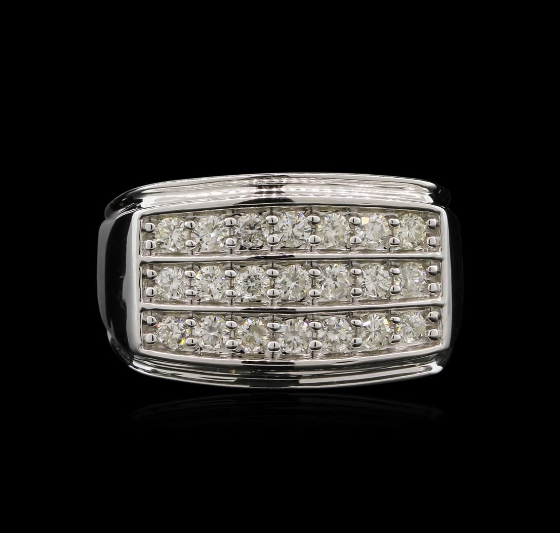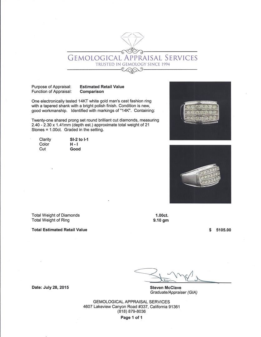 One electronically tested 14KT white gold man's cast fashion ring with a tapered shank with a bright polish finish. Identified with markings of "14K". Condition is new, good workmanship. Containing: Twenty-One shared prong set round brilliant cut diamonds, measuring 2.40 - 2.30 x 1.41mm (depth est.) approximate. Total Weight of 21 Stones = 1.00ct. Graded in the setting. Clarity: SI-2 to I-1. Color: H - I. Cut Good. Total Weight of Diamonds 1.00ct. Total Weight of Ring 9.10gm. GAS Appraised at $5,105.00.