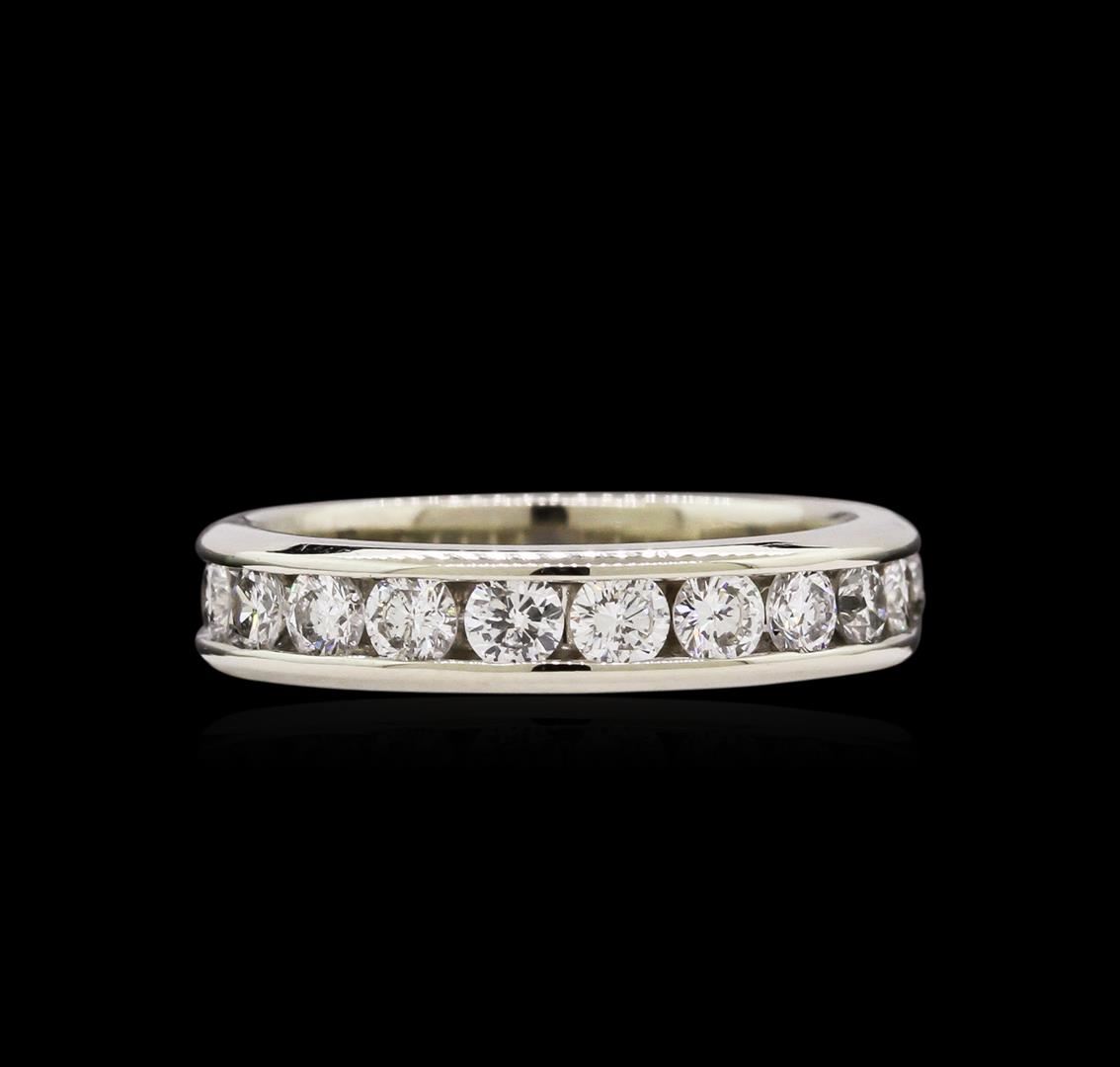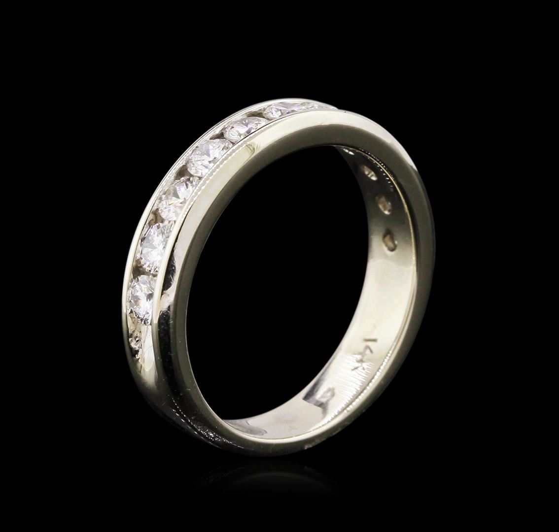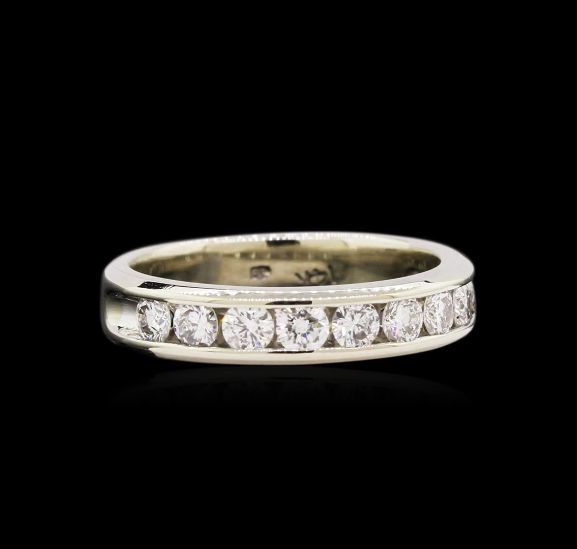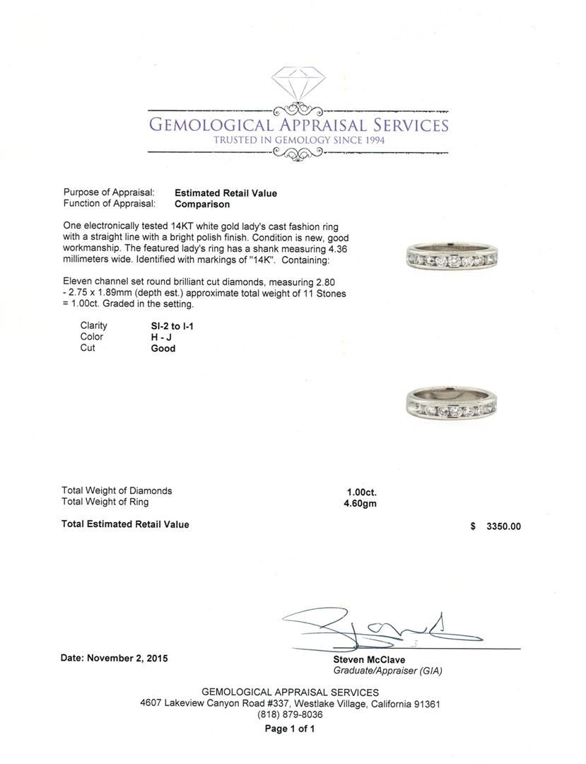One electronically tested 14KT white gold lady's cast fashion ring with a straight line with a bright polish finish. The featured lady's ring has a shank measuring 4.36 millimeters wide. Identified with markings of "14K". Condition is new, good workmanship. Containing: Eleven channel set round brilliant cut diamonds, measuring 2.80 - 2.75 x 1.89mm (depth est.) approximate total weight of 11 Stones = 1.00ct. Graded in the setting. Clarity: SI-2 to I-1. Color: H - J. Cut Good. Total Weight of Diamonds 1.00ct. Total Weight of Ring 4.60gm. GAS Appraised at $3,350.00.