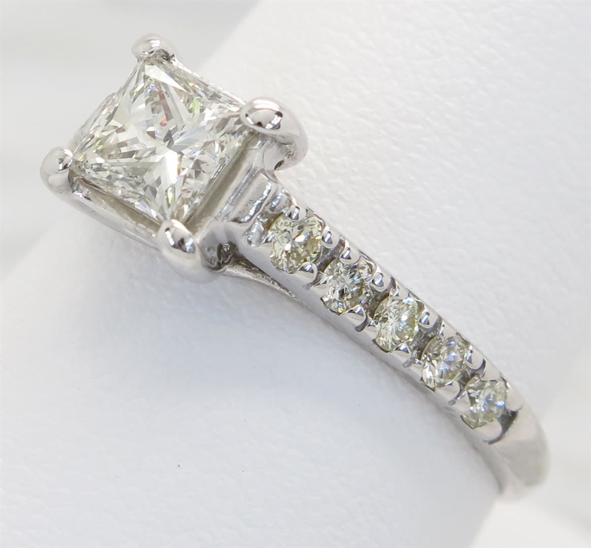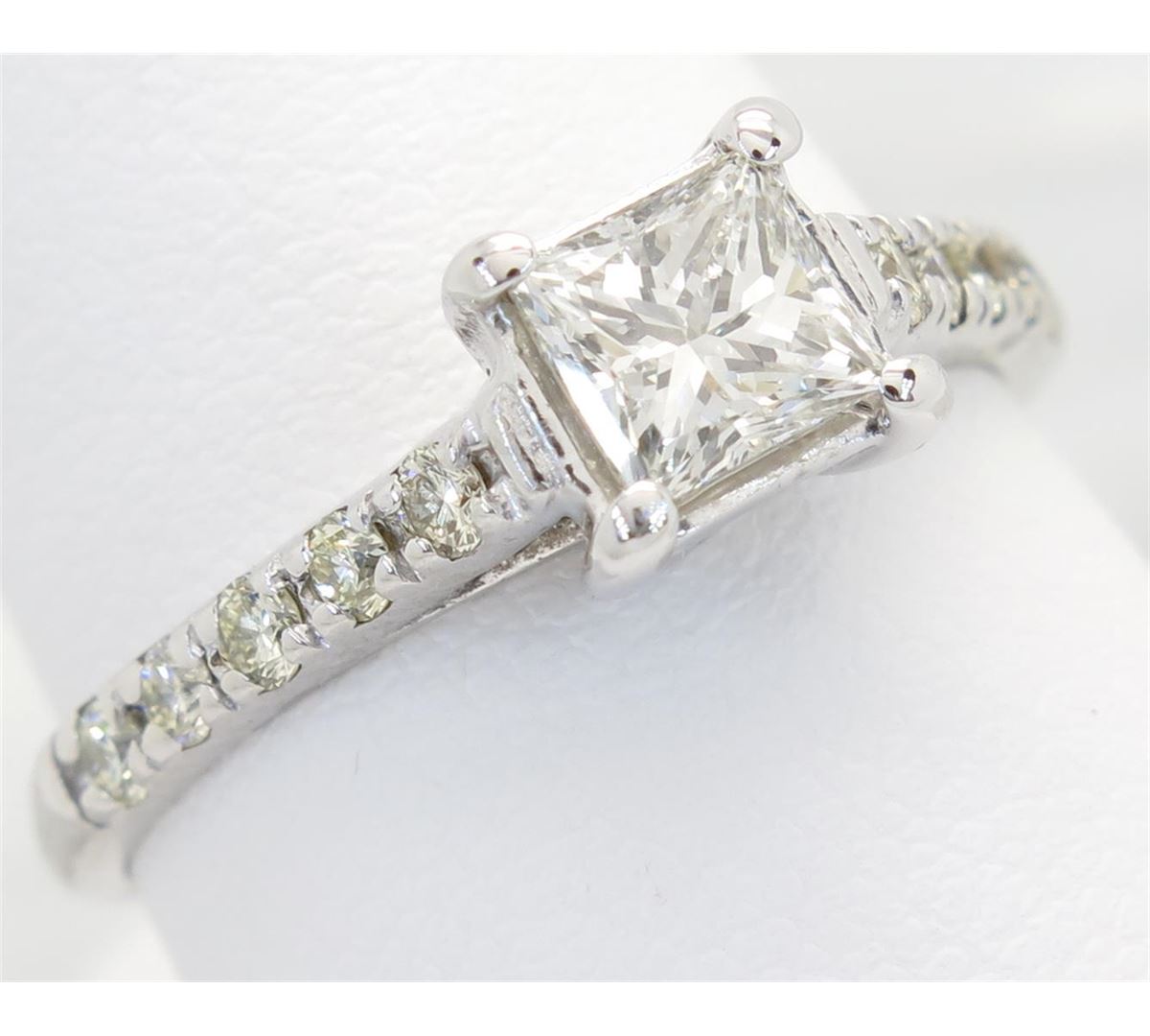 One tested 14K white gold diamond ring. Containing: One Princess Cut Diamond. Approximate Size: .70CT. Clarity: SI2, Color: G-H. 10 Round Brilliant Cut Diamonds. Approximate total diamond weight: 1.00CTW. All diamonds are graded in the mounting unless otherwise stated. Weight of ring: 2.9 grams, Size: 7.25