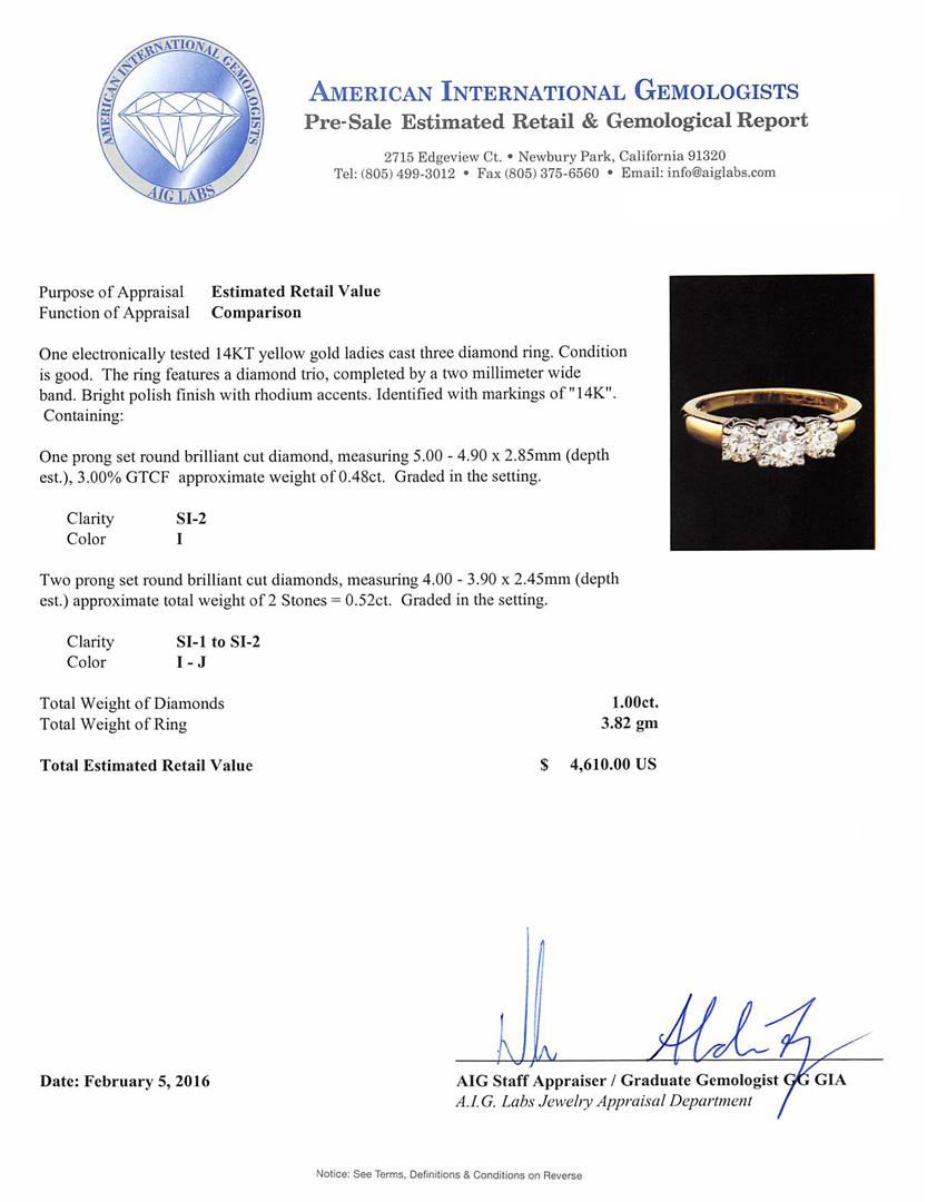 One electronically tested 14KT yellow gold ladies cast three diamond ring. The ring features a diamond trio, completed by a two millimeter wide band. Bright polish finish with rhodium accents. Identified with markings of "14K". Condition is good. Containing: One prong set round brilliant cut diamond, measuring 5.00 - 4.90 x 2.85mm (depth est.), 3.00.%. GTCF approximate weight of 0.48ct. Graded in the setting. Clarity: SI-2. Color: I Two prong set round brilliant cut diamonds, measuring 4.00 - 3.90 x 2.45mm (depth est.) approximate total weight of 2 Stones = 0.52ct. Graded in the setting. Clarity: SI-1 to SI-2. Color: I - J. Total Weight of Diamonds 1.00ct. Total Weight of Ring 3.82gm. AIG Appraised at $4,610.00.