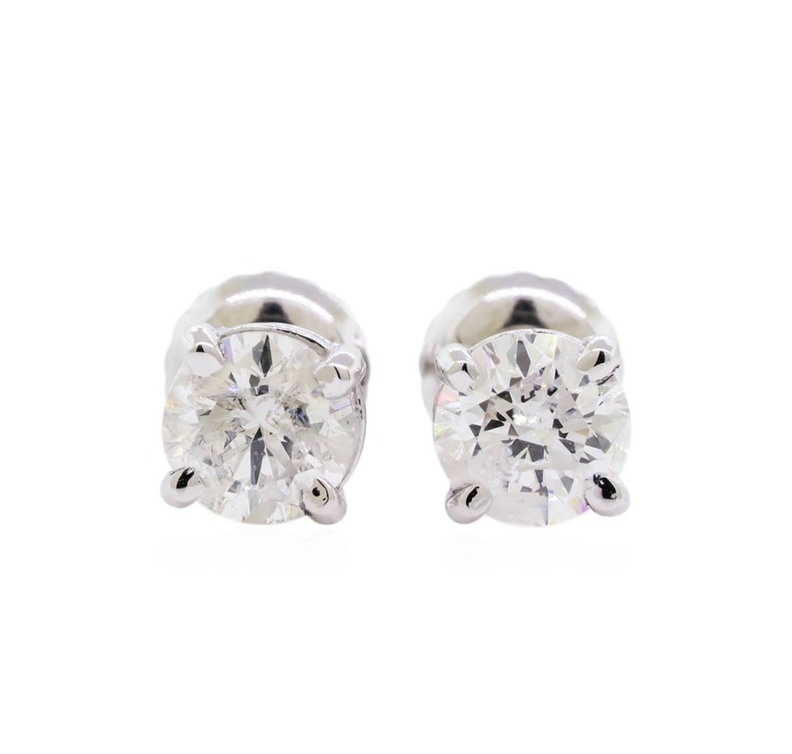 One pair electronically tested 14KT white gold lady's combination cast & assembled stud earrings with threaded posts and screw-on/screw-off backs with a bright polish finish. Identified with markings of "14K". Condition is new, good workmanship. Containing: Two prong set round brilliant cut diamonds, measuring 5.01 - 4.90 x 3.22mm (depth est.) approximate total weight of 2 Stones = 1.00ct. Graded in the setting. Clarity: I-1. Color: G - Good. Total Weight of Diamonds 1.00ct. Total Weight of Earrings 1.20gm. GAS Appraised at $6,420.00.