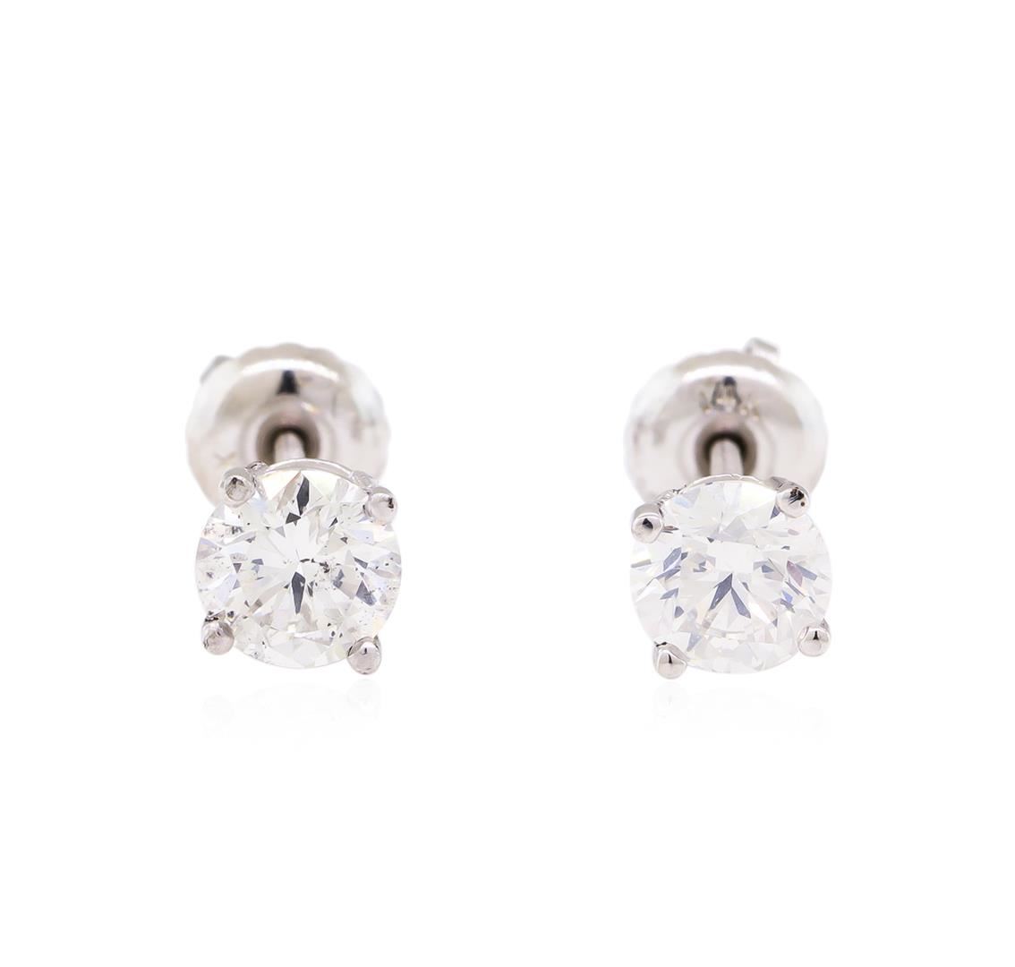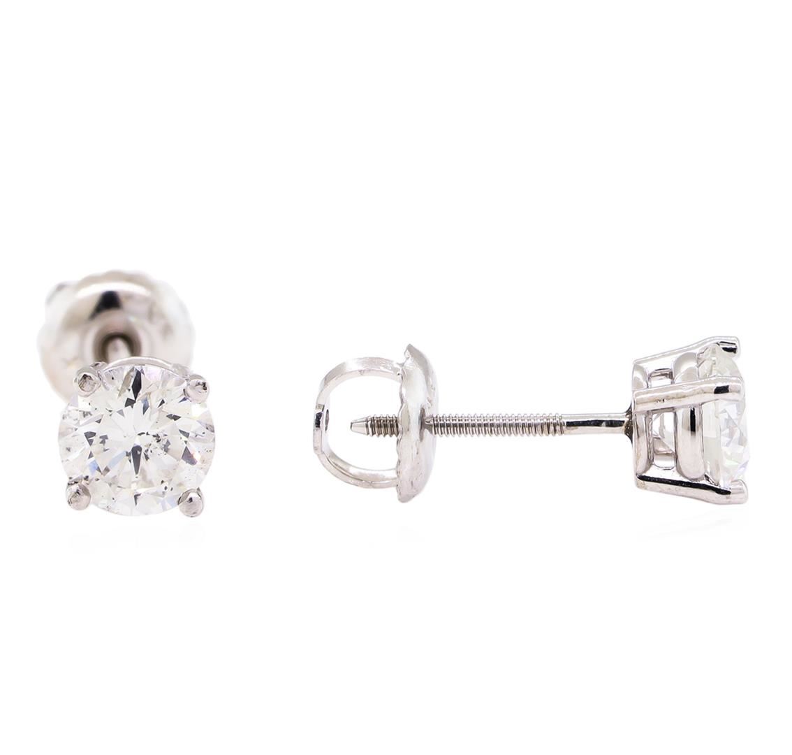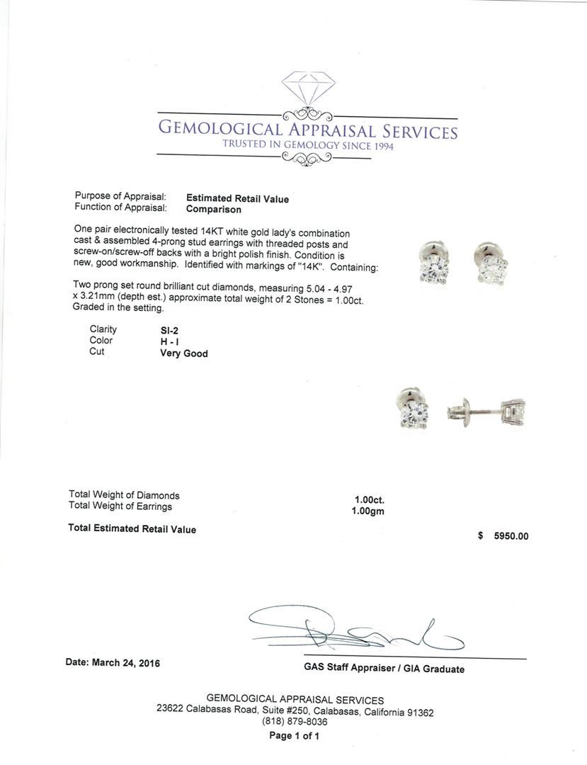 One pair electronically tested 14KT white gold lady's combination cast & assembled 4-prong stud earrings with threaded posts and screw-on/screw-off backs with a bright polish finish. Identified with markings of "14K". Condition is new, good workmanship. Containing: Two prong set round brilliant cut diamonds, measuring 5.04 - 4.97 x 3.21mm (depth est.) approximate total weight of 2 Stones = 1.00ct. Graded in the setting. Clarity: SI-2. Color: H - I. Cut Very Good. Total Weight of Diamonds 1.00ct. Total Weight of Earrings 1.00gm. GAS Appraised at $5,950.00.