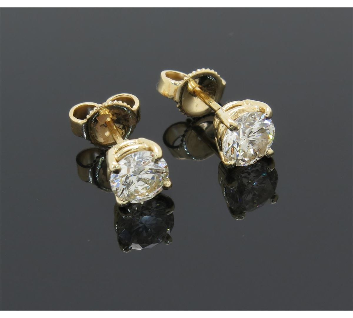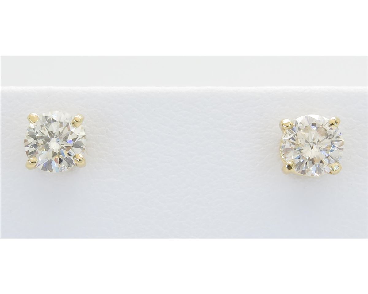 One tested 14K yellow gold pair of diamond earrings. Containing: Two Round Brilliant Cut Diamonds. Clarity: SI2-I1, Color: I-J. Approximate total diamond weight: 1.00CTW. Diamonds are graded in the mounting, unless otherwise stated. Weight: 1.2 grams.