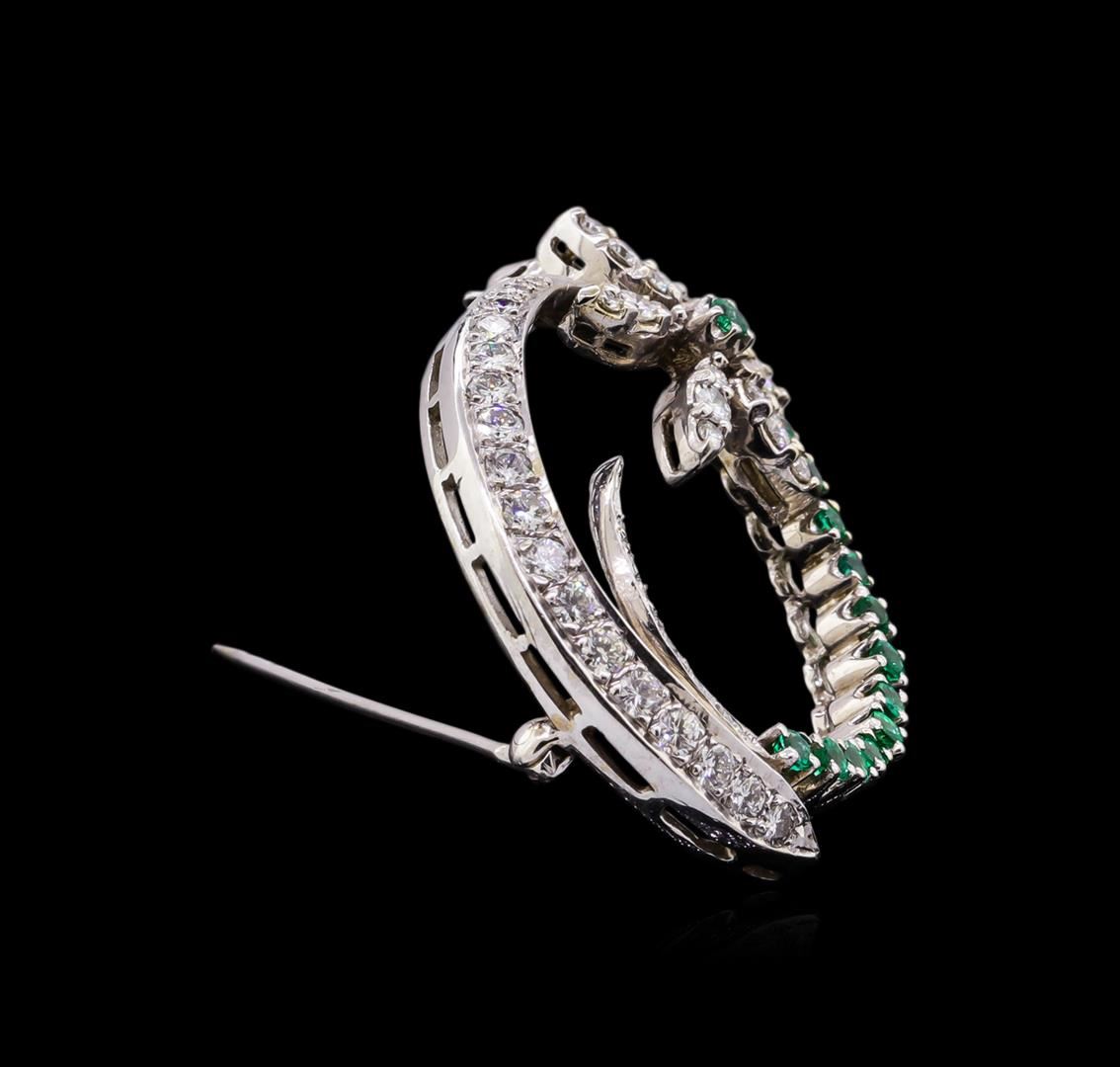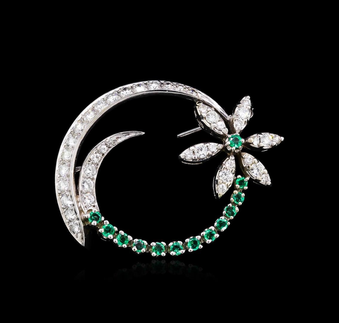 One electronically tested 14KT white gold ladies cast & assembled diamond & emerald brooch with a bright finish. The 38 x 29mm brooch features an emerald & diamond floret, supported by an emerald & diamond ribbon on the left and a diamond ribbon on the right. The ribbons converge at the top of the brooch. The vertical place pin is located just behind the floret. Condition is good. Containing: Forty-One prong set round brilliant cut diamonds, measuring 2.20 - 1.40 x 1.10mm (depth est.) approximate total weight of 41 Stones = 1.00ct. Graded in the setting. Clarity: VS-1 to VS-2. Color: G - I Thirteen prong set round mixed cut natural emeralds, measuring 2.20 - 1.90 x 1.33 mm, approximate total weight of 0.52ct., clarity is slightly included, type III, medium dark, moderately strong, bluish green color, (GIA bg 6/4), cut is good. Transmitting light with no distortion, transparent. Naturally occurring internal & external characteristics are present. Graded in the setting. Total Weight of Colored Stones 0.52ct. Total Weight of Diamonds 1.00ct. Total Weight of Brooch 7.34gm. AIG Appraised at $5,100.00.