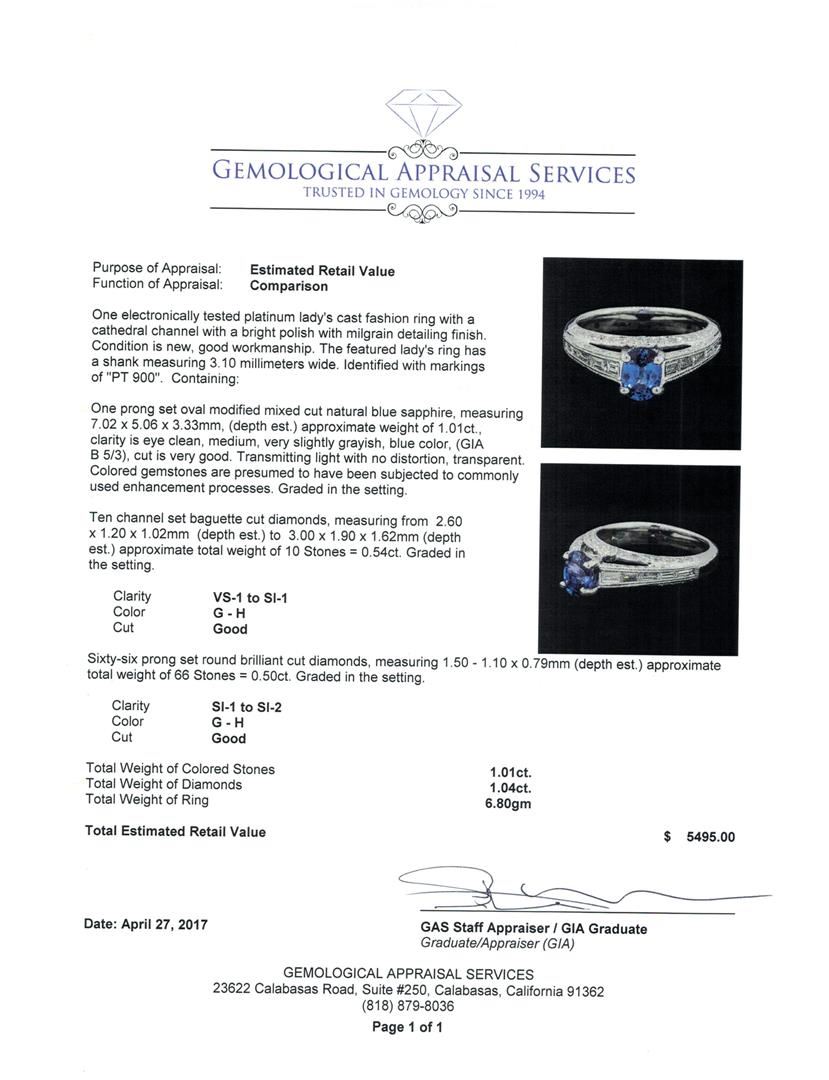 One electronically tested platinum lady's cast fashion ring with a cathedral channel with a bright polish with milgrain detailing finish. The featured lady's ring has a shank measuring 3.10 millimeters wide. Identified with markings of 'PT 900'. Condition is new, good workmanship. Containing: One prong set oval modified mixed cut natural blue sapphire, measuring 7.02 x 5.06 x 3.33mm, (depth est.) approximate weight of 1.01ct., clarity is eye clean, medium, very slightly grayish, blue color, (GIA B 5/3), cut is very good. Transmitting light with no distortion, transparent. Colored gemstones are presumed to have been subjected to commonly used enhancement processes. Graded in the setting. Ten channel set baguette cut diamonds, measuring from 2.60 x 1.20 x 1.02mm (depth est.) to 3.00 x 1.90 x 1.62mm (depth est.) approximate total weight of 10 Stones = 0.54ct. Graded in the setting. Color G - H Clarity VS-1 to SI-1 Cut Good Sixty-Six prong set round brilliant cut diamonds, measuring 1.50 - 1.10 x 0.79mm (depth est.) approximate total weight of 66 Stones = 0.50ct. Graded in the setting. Color G - H Clarity SI-1 to SI-2 Cut Good. Total Weight of Colored Stones 1.01ct.. Total Weight of Diamonds 1.04ct.. Total Weight of Ring 6.80gm GAS Appraised at $5495.00. GAS Appraised at $5,495.00.